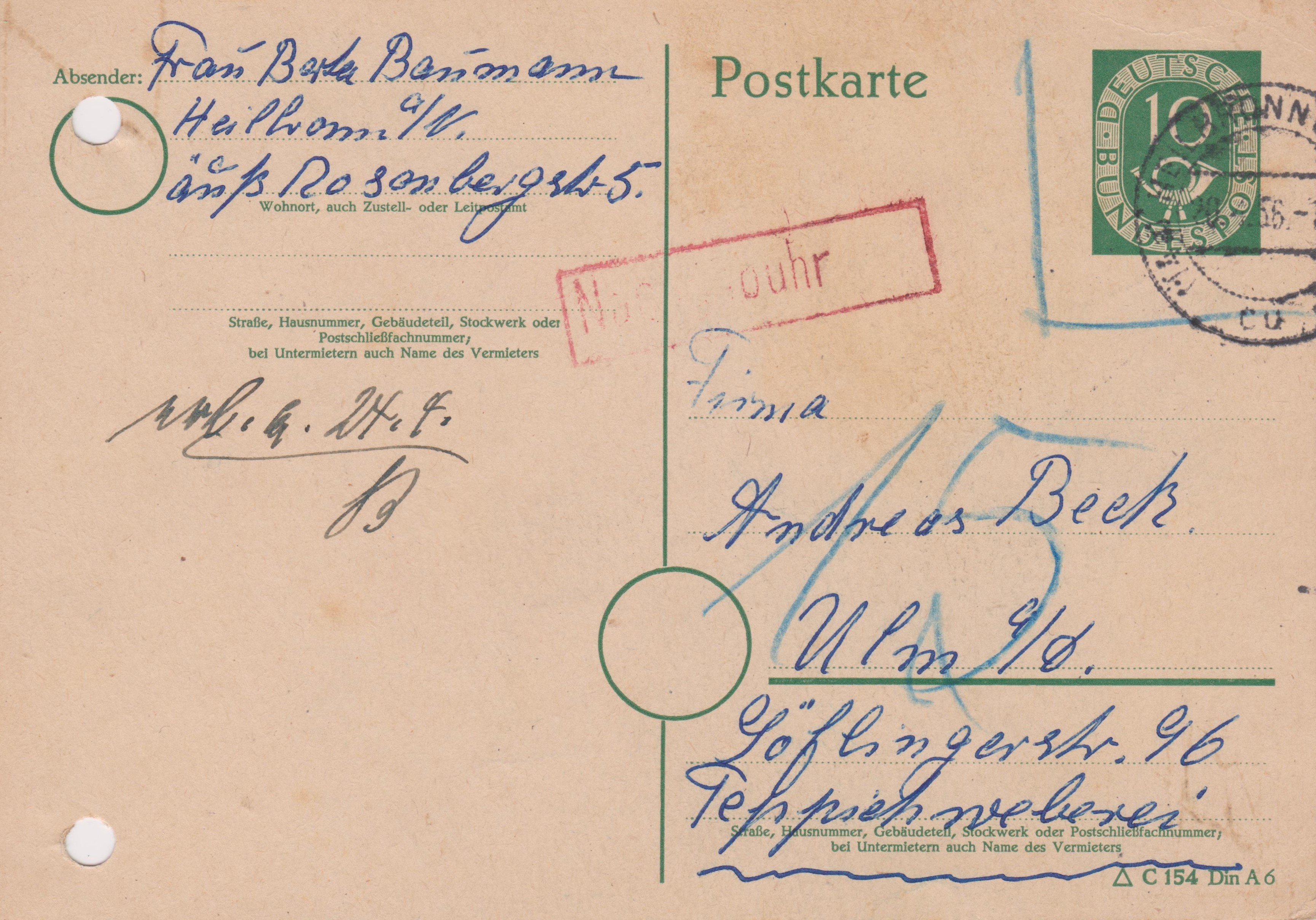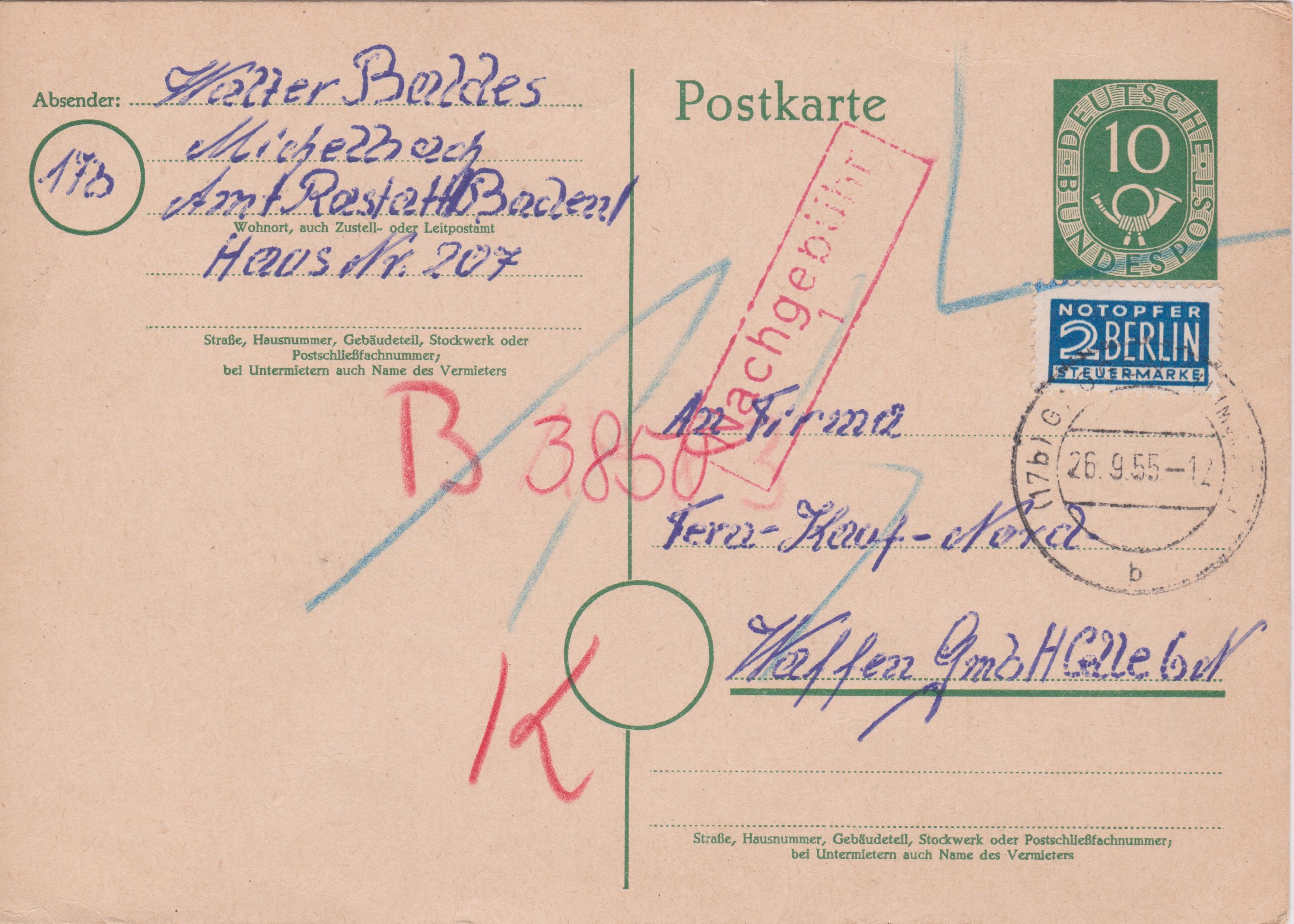 Die Dauerserie Posthorn war gültig bis zum 31.12.1954, weshalb das eingedruckte Postwertzeichen mit Blaustift umrahmt wurde und das Eineinhalbfache des Fehlportos von 10 Pf gleich "15" Pf mit Blaustift als beim Empfänger einzuziehende Nachgebühr vermerkt wurde, worauf ein Stempel "Nachgebühr" in Rot hinweist!