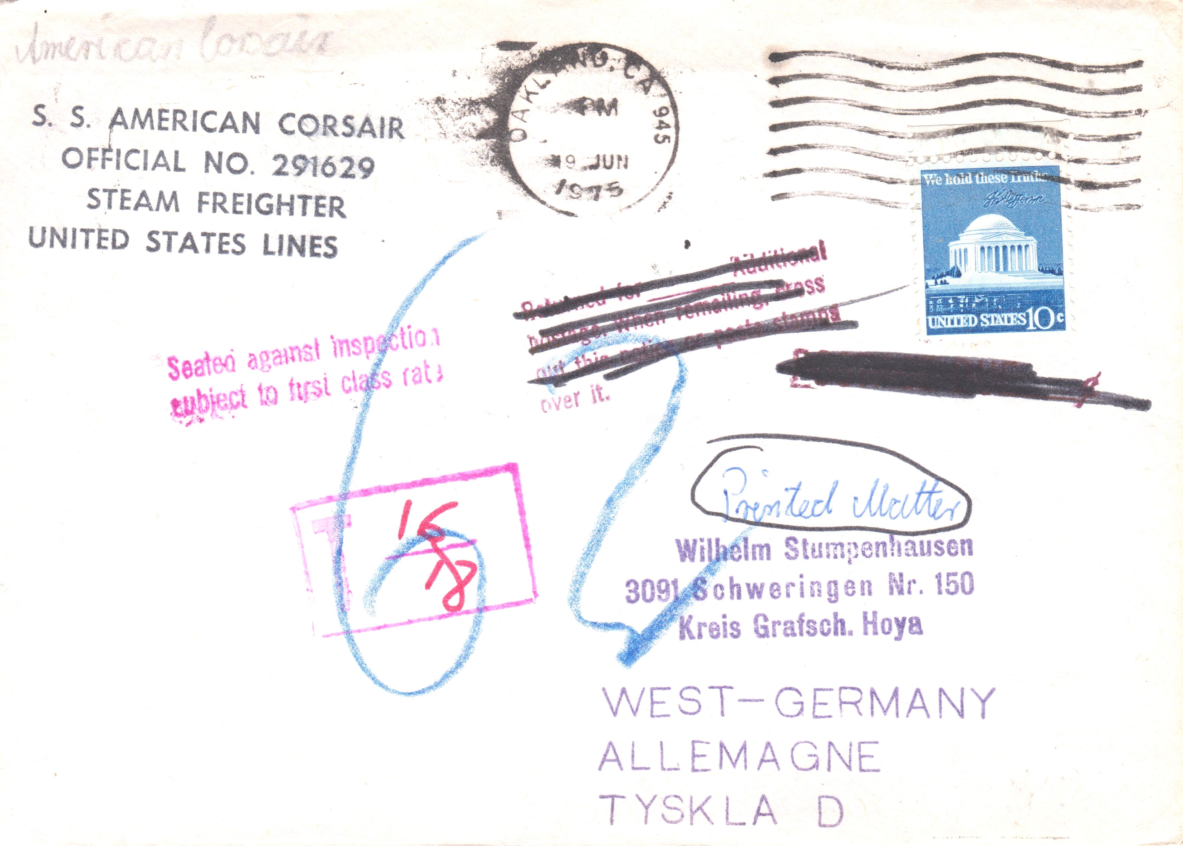 Die andere Postkarte hingegen wurde mit "13" Pfennig als Nachgebühr belegt, was per Blaustift vermerkt wurde und worauf ein Stempel "Nachgebühr" in Rot vom 15.07.1959 hinweist.