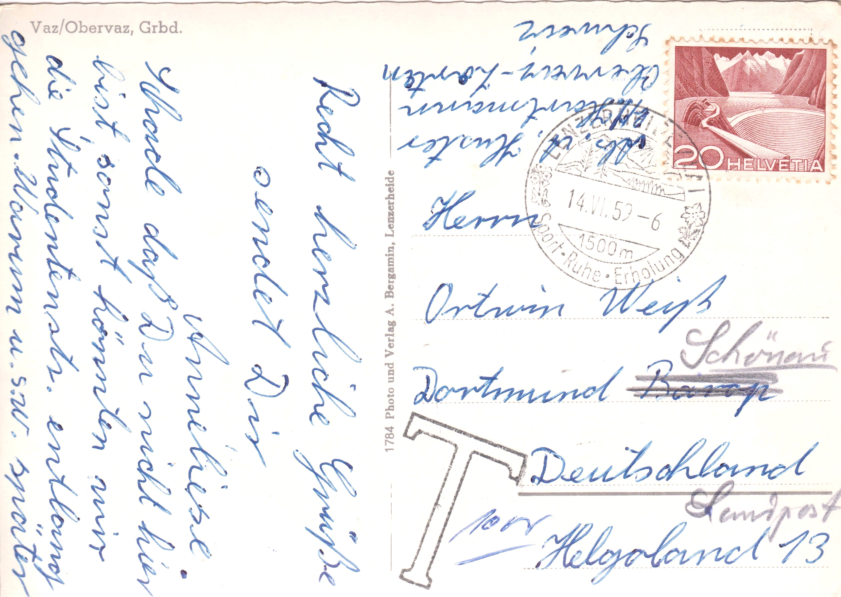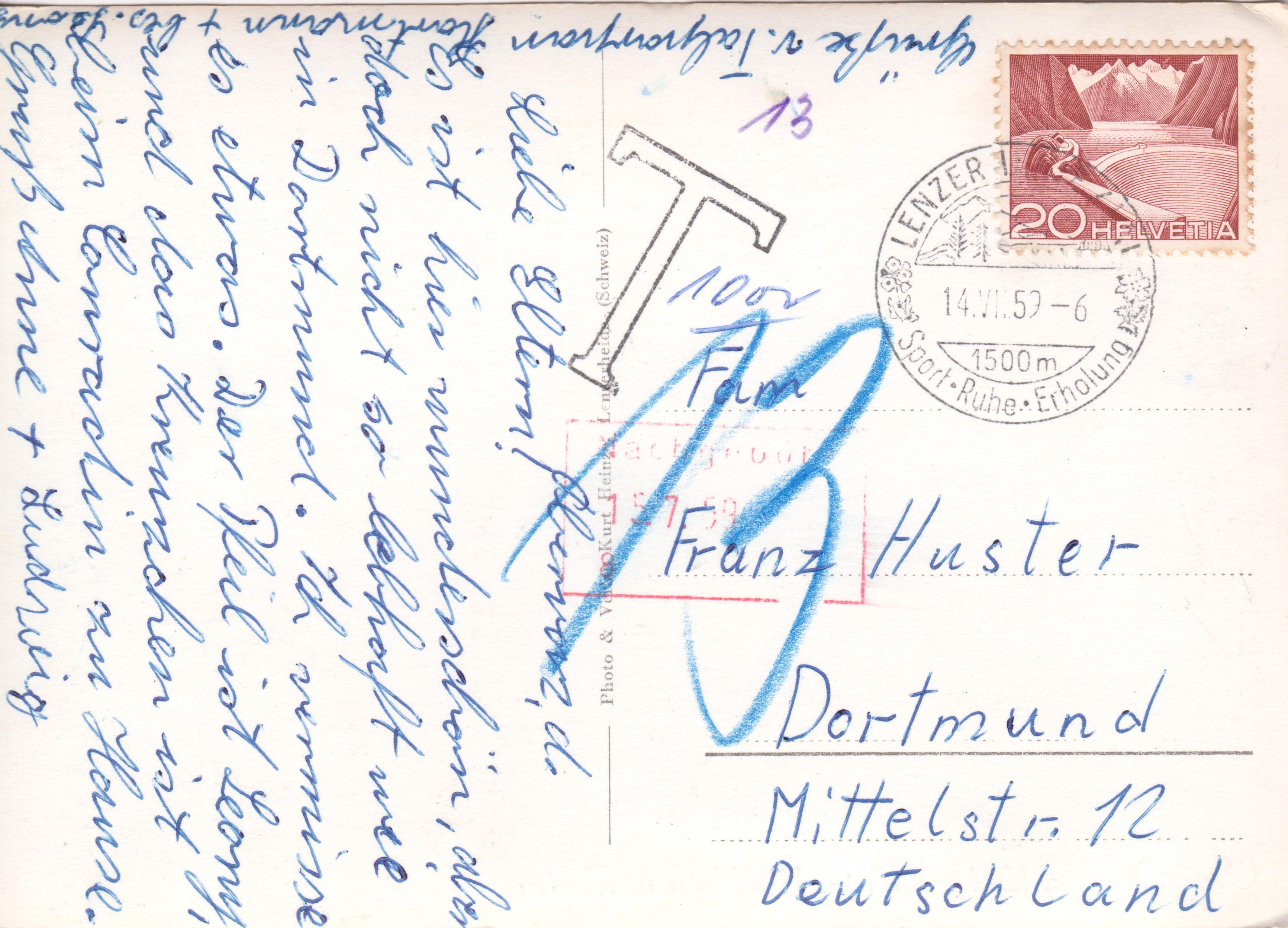 Die andere Postkarte hingegen wurde mit "13" Pfennig als Nachgebühr belegt, was per Blaustift vermerkt wurde und worauf ein Stempel "Nachgebühr" in Rot vom 15.07.1959 hinweist.