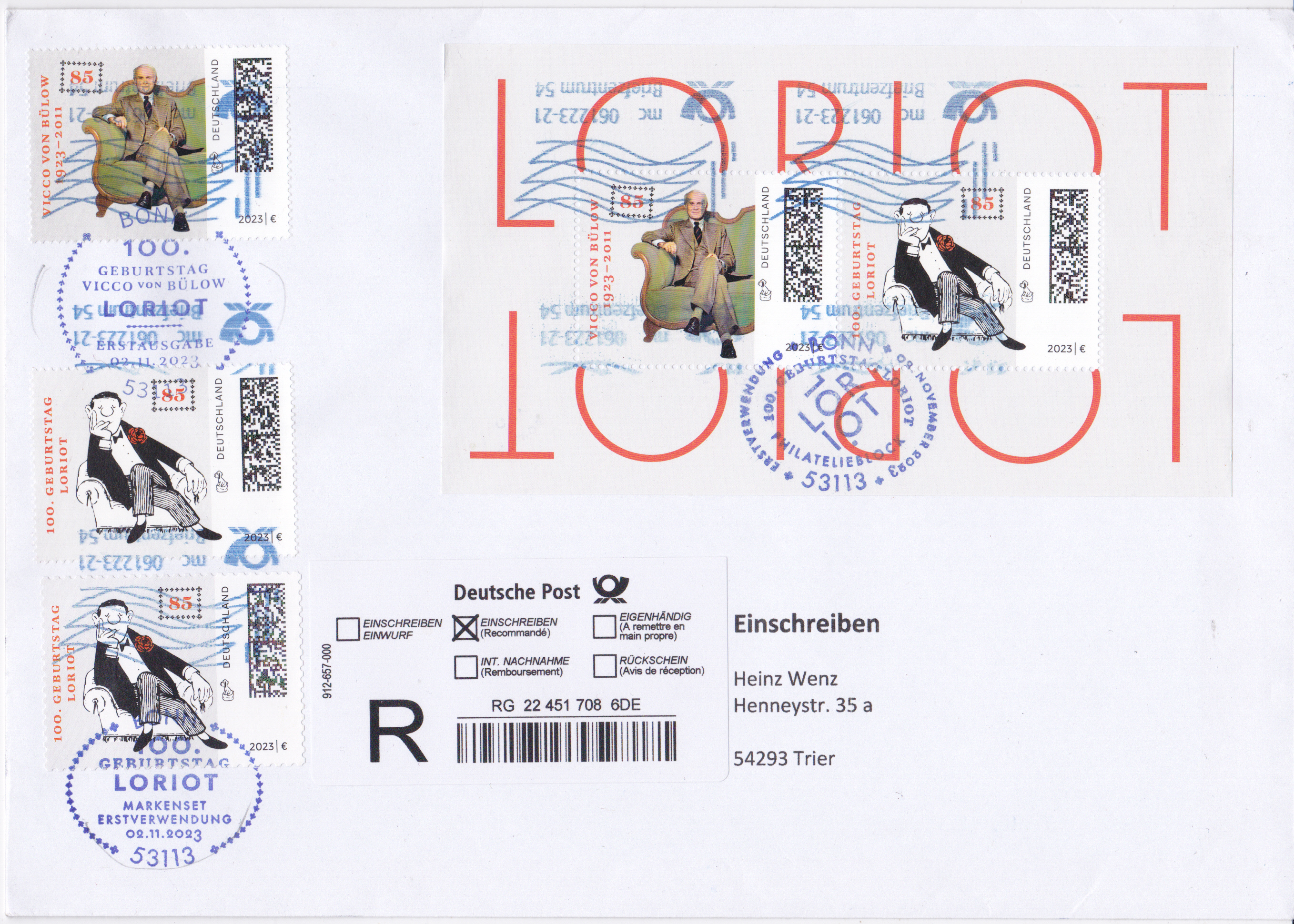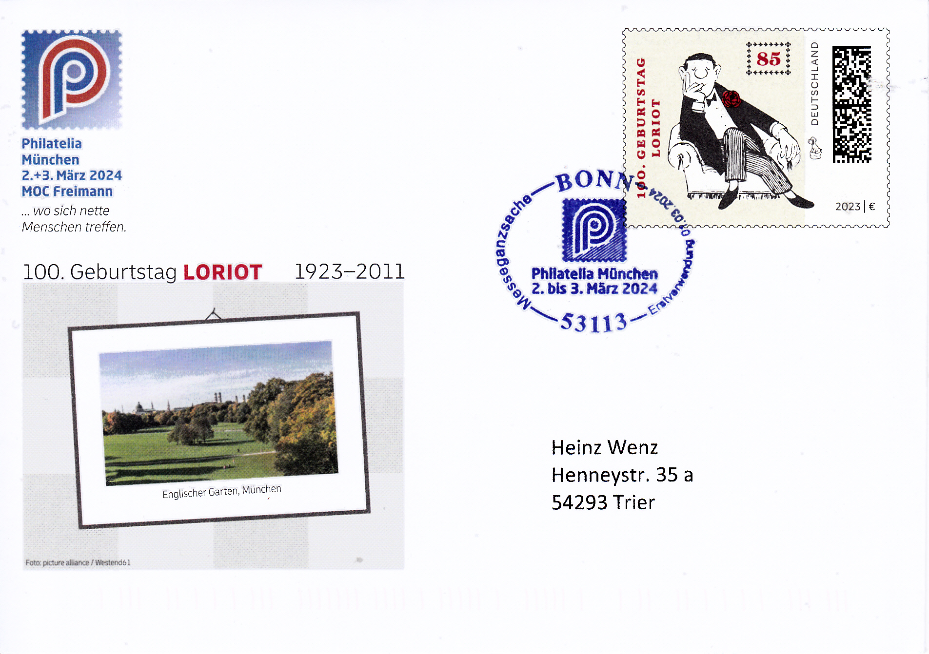Diese Messeganzsache mit dem Wertzeicheneindruck im Muster der Marke (MiNr 3800) mit von Bülow alias Loriot ist mit dem Erstverwendungsstempel Bonn gestempelt.