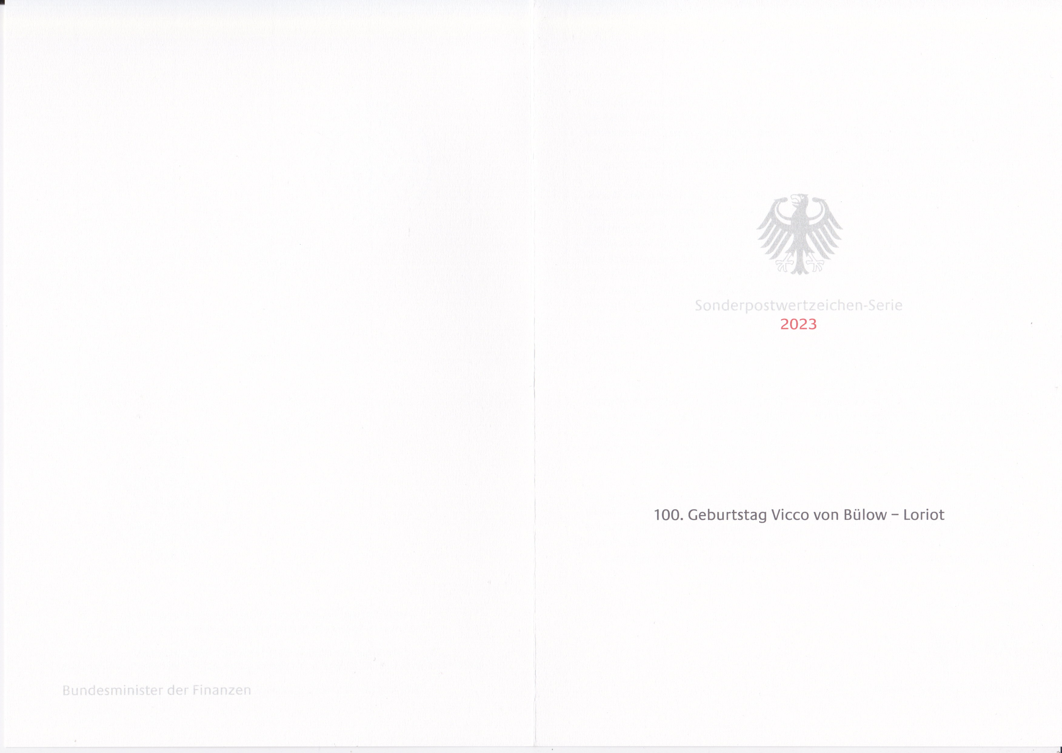 Klappkarte des Vorstandsvorsitzenden der Deutschen Post AG mit den beiden Marken (MiNr 3794 und 3795) zum 100. Geburtstag von Vicco von Bülow (1923-2013; deutscher Zeichner und Humorist) und dem Ersttagsonderstempel Bonn.