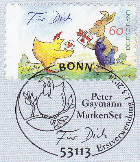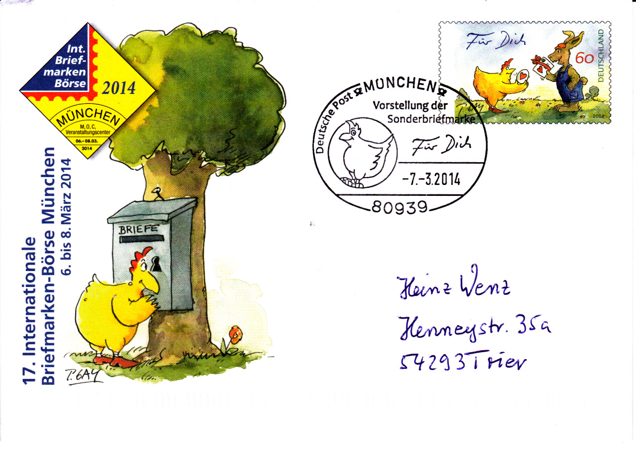Zur 17. Internationalen Briefmarken-Börse München vom 6. bis 8. März 2014 verausgabte die Deutsche Post einen Sonderumschlag mit dem Wertstempel der MiNr 3064 mit einer Zeichnung von Peter Gaymann (*1950, Cartoonist und Schriftsteller) mit dem Titel "Das Ostergeschenk". Der Brief ist mit dem Sonderstempel zur Vorstellung der Markenausgabe während der Messe München am 7.3.2014 abgestempelt.