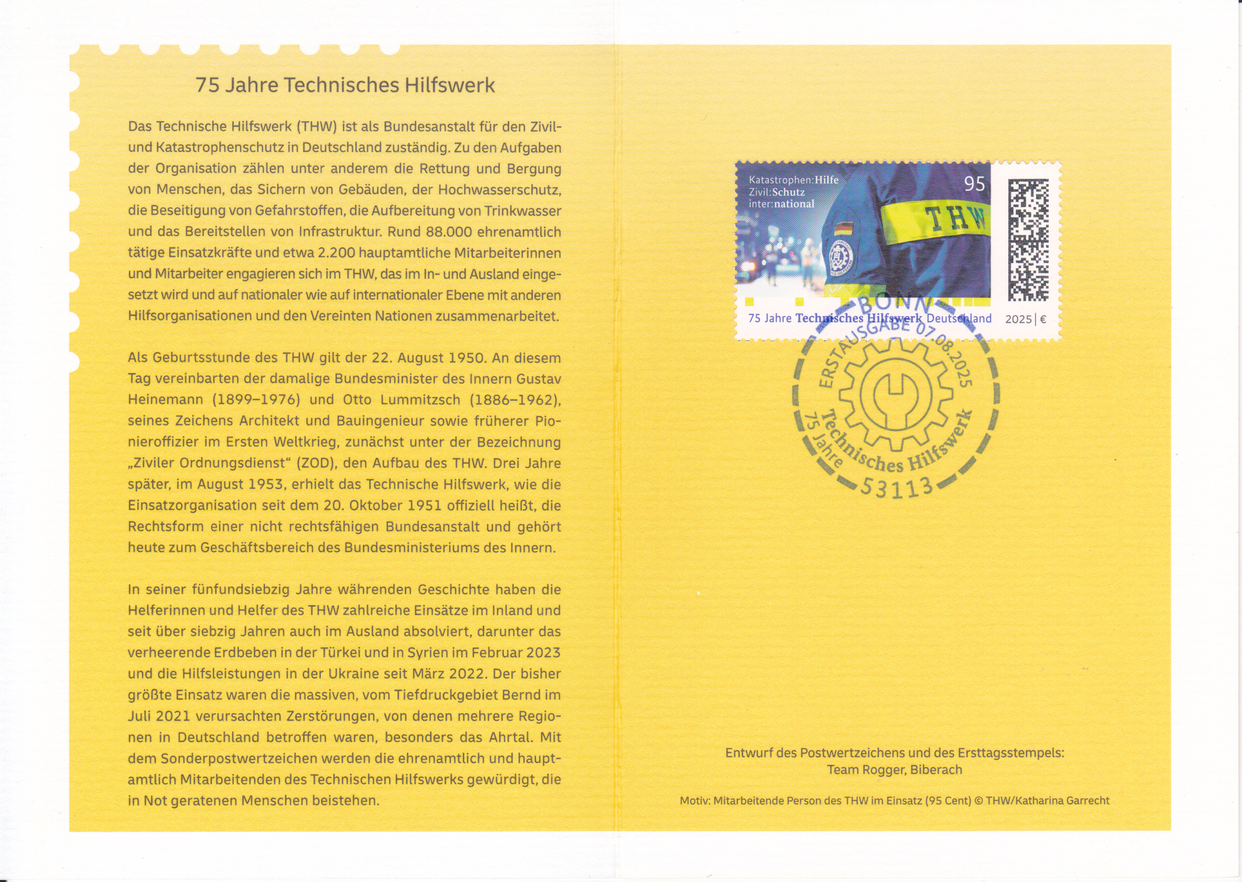 Zur Briefmarkenausstellung NAPOSTA 2025 in Remseck erschien ein Ganzsachenumschlag mit einem Wertstempel im Muster der Marke "75 Jahre Technisches Hilfswerk" (MiNr 3922).