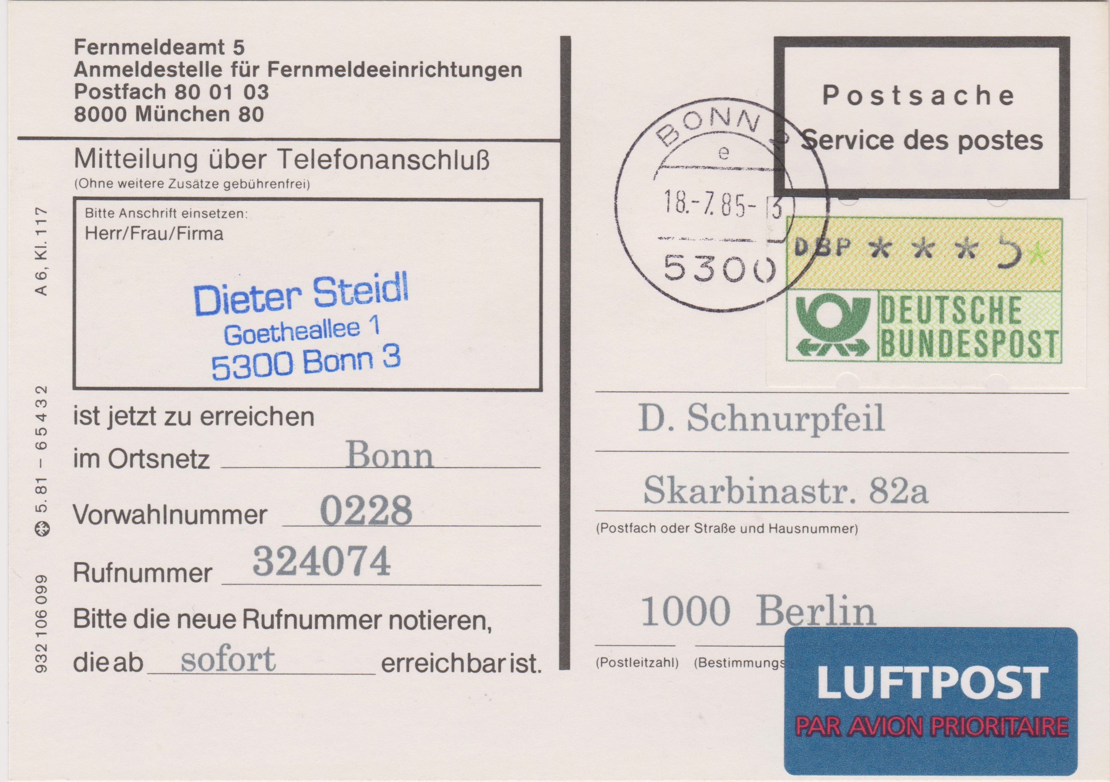 Lediglich die in diesem Falle gewünschte Beförderung per Luftpost nach Berlin war portopflichtig und kostete 1985 die Inlandsluftpostgebühr von 5 Pfennig, die hier am 18.07.1985 in Bonn in Form einer Automatenmarke entrichtet wurde: