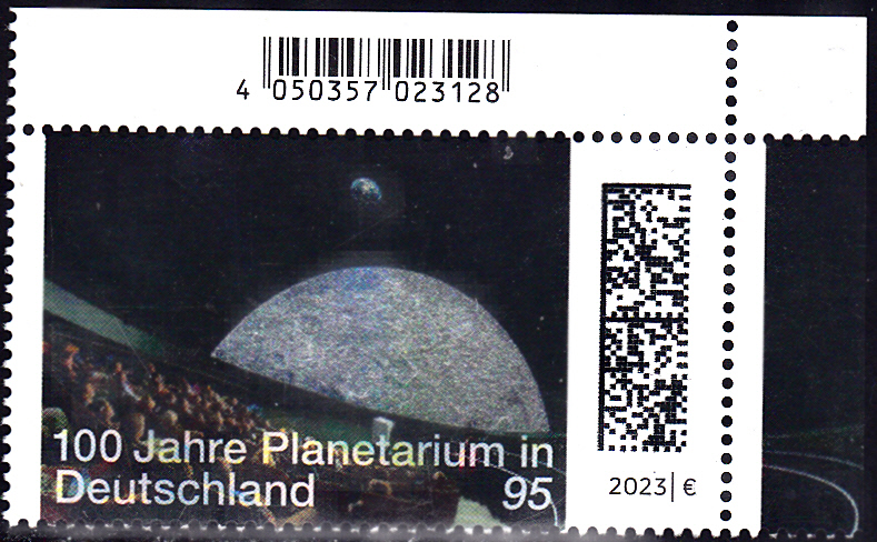 Zum Jubiläum "100 Jahre planetarische Vorführungen in Deutschland" ist bei der Deutschen Post eine Marke (MiNr 3789) erschienen. Sie zeigt die Darstellung des Mondes und der Erde auf der Projektionskuppel eines Planetariums, konzipiert von der Firma Carl Zeiss in Jena 1923.