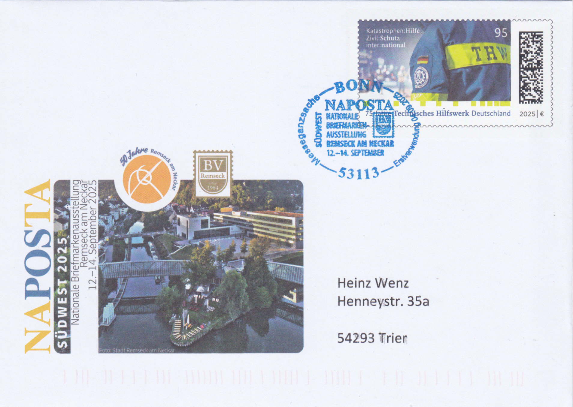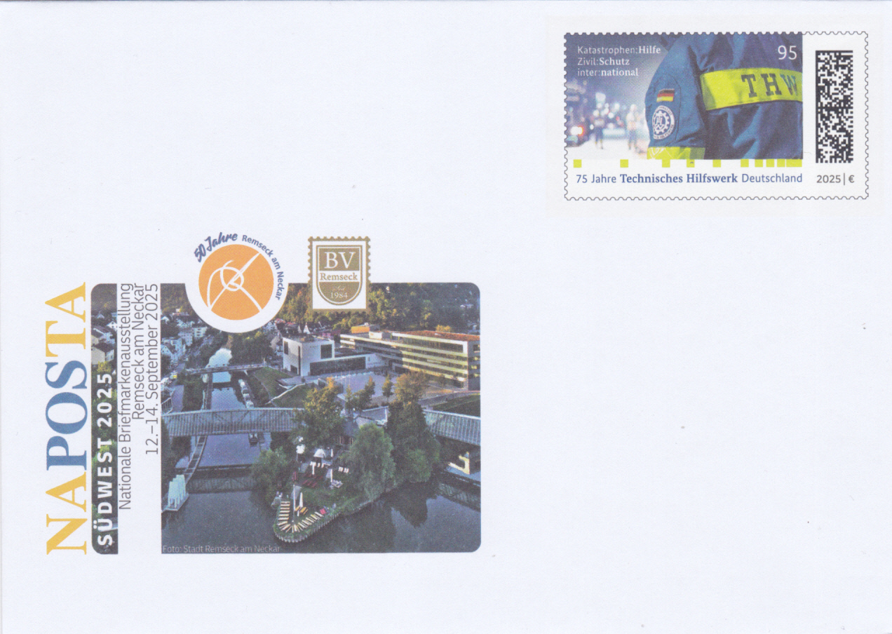 Zur Briefmarkenausstellung NAPOSTA 2025 in Remseck erschien ein Ganzsachenumschlag mit einem Wertstempel im Muster der Marke "75 Jahre Technisches Hilfswerk" (MiNr 3922).