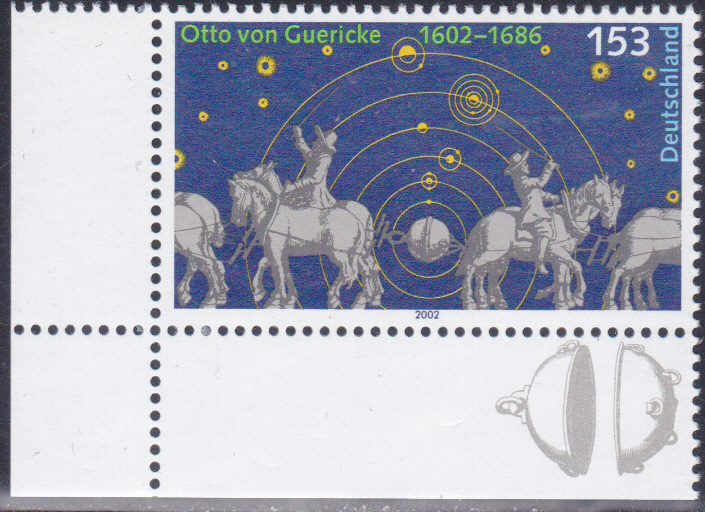 Die Marke der Deutschen Post zum 400. Geburtstag von Otto von Guericke (MiNr 2282) zeigt das Kopernikanisches Weltbild und den Halbkugelversuch mit 16 Pferden nach Kupferstichen aus der "Experimenta nova (ut vocantur) de vacuo spatio" von Otto v. Guericke (1602-1686, Ingenieur und Physiker).