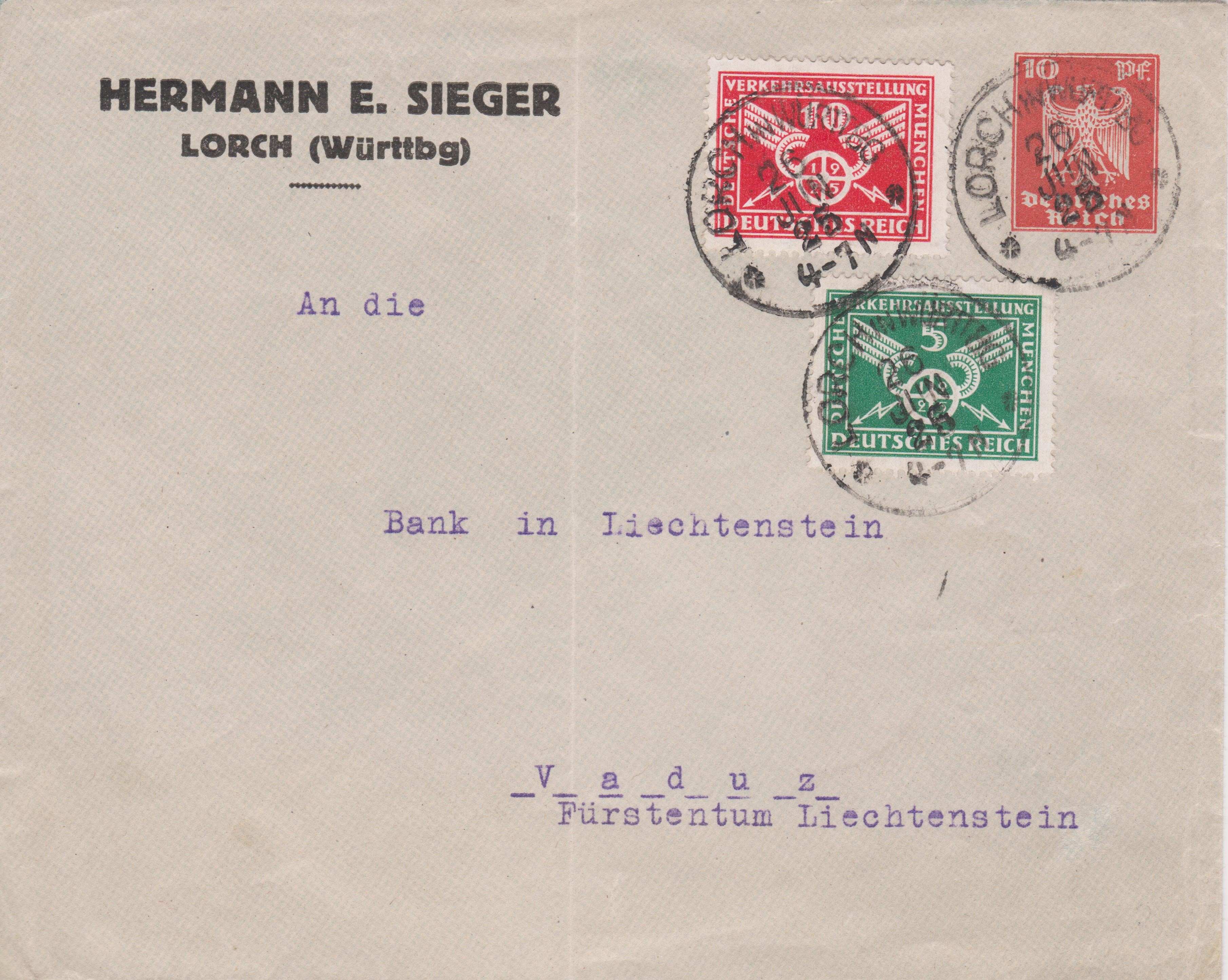 Der Beleg lief nach VADUZ in Liechtenstein und erhielt rückseitig einen entsprechenden Tagesstempel als Ankunftstempel.