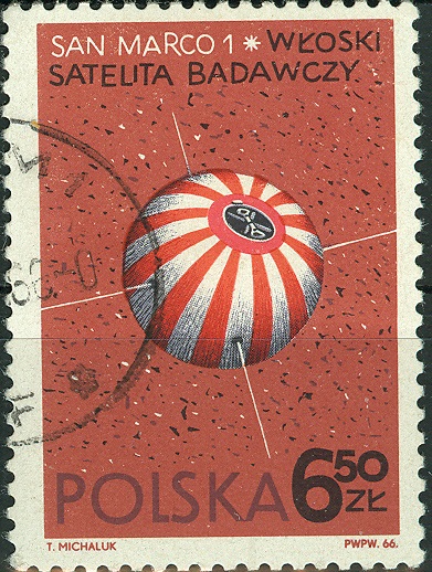 Italiens erster Satellit heisst "San Marco1". Und wird hier auf einer polnischen Marke aus dem Jahr 1966 gezeigt.