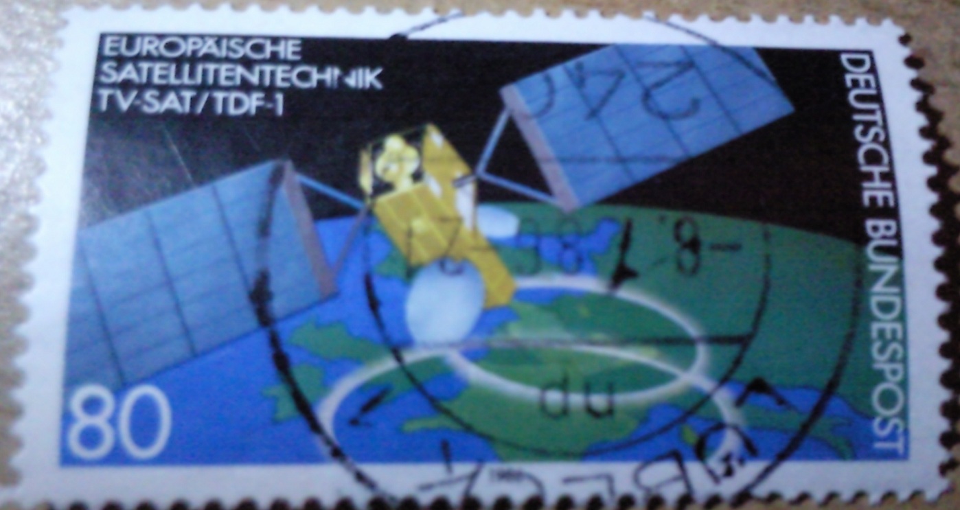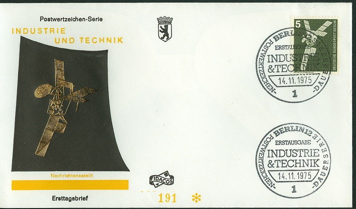 Auf dieser Berliner Freimarke aus dem Jahr 1975 (MiNr. 494) ist dieser Nachrichtensatellit das umgesetzte Motiv. (Eine bildgleiche Bund-Freimarke ist die MiNr. 846)