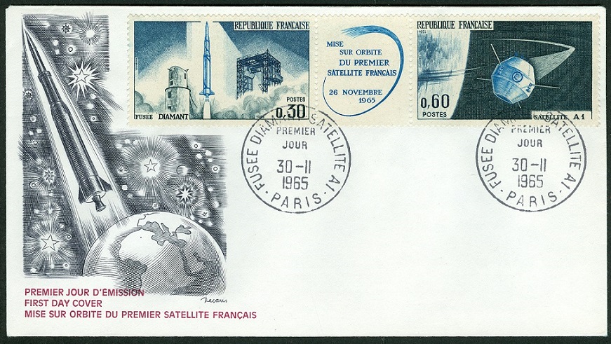 Anlässlich des ersten französischen Satelliten "Astérix" im Orbit, benannt nach dem Comichelden "Asterix", gab die französische Post am 30. Februar 1965 einen Zusammendruck, bestehend aus 2 Marken und einem mittigen Zwischenfeld (Zf), heraus.