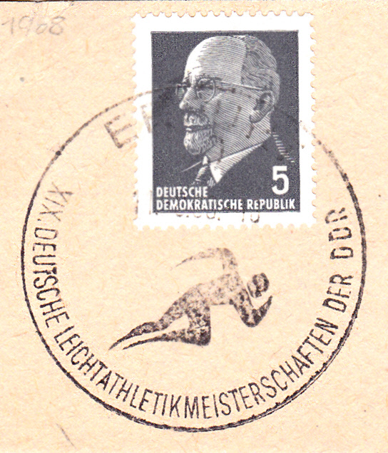 Sonderstempel aus Erfurt aus dem Jahre 1968 (Datum leider nicht lesbar) zu den XIX. Leichtathletik-Meisterschaften der DDR. Im Stempelbild ein stilisierter Kurzstreckenläufer beim Start.