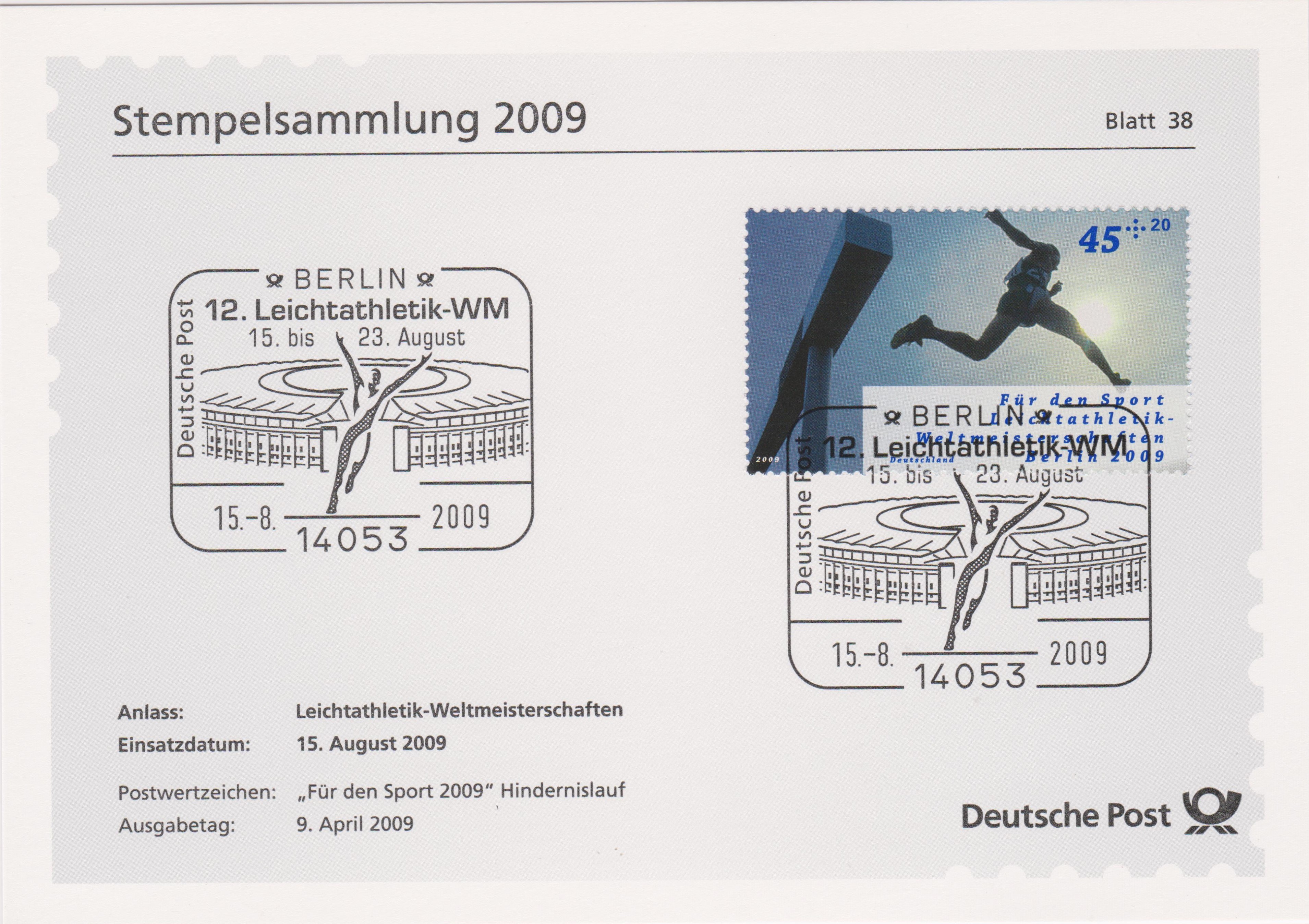 Das von Heinz hier bereits vorgestellte Postwertzeichen zu 45 + 20 Cent, MiNr. 2727, zeigt einen Hindernisläufer beim Überqueren einen Hindernisses, hier mit passendem Sonderstempel zur Eröffnung der 12. Lechtathletik-WM in Berlin am 15.08.2009 auf Blatt 38 der Deutsche Post Stempelsammlung 2009:
