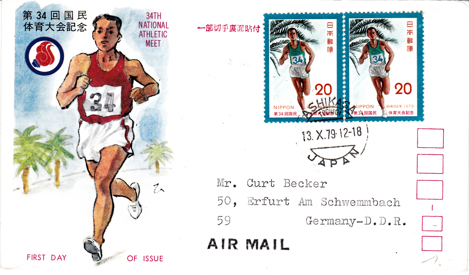 In Japan erschien zum 34. nationalen Sportfest in Miyazaki 1959 eine Marke (MiNr 1407) mit der Abbildung eines Läufers b(vermutlich über eine Langstrecke oder Marathon). Hier ein Brief von Ashikaga Erfurt mit neinem Paar dieser Marke . Der Brief wurde am Erstausgabetag der Marke gestempelt. Rückseitig befindet sich eine weitere Marke zur Abdeckung des Portos.