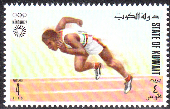 Eine Marke aus Kuwait (MiNr 544) zu den Spielen 1972 in München bildet einen Läufer kurz nach dem Start ab.