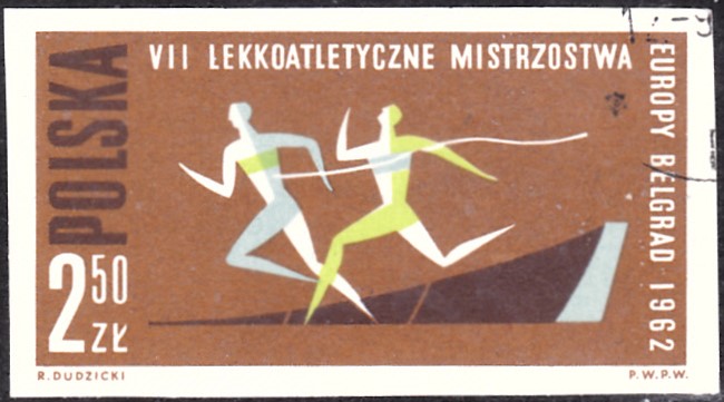 Die hier schon gezeigte Marke aus Polen zu den Leichtathletik-Europameisterschaften 1962 in Belgrad mit der Abbildung von zwei stilisierten Kurzstreckenläufer am Ziel gibt es auch als geschnittene Marke (MiNr 1344 B).