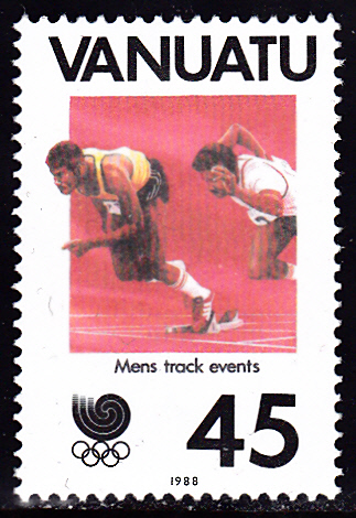 Auf dieser Marke aus Vanuatu (MiNr 794) sind zwei Sprinter beim Start zu sehen.