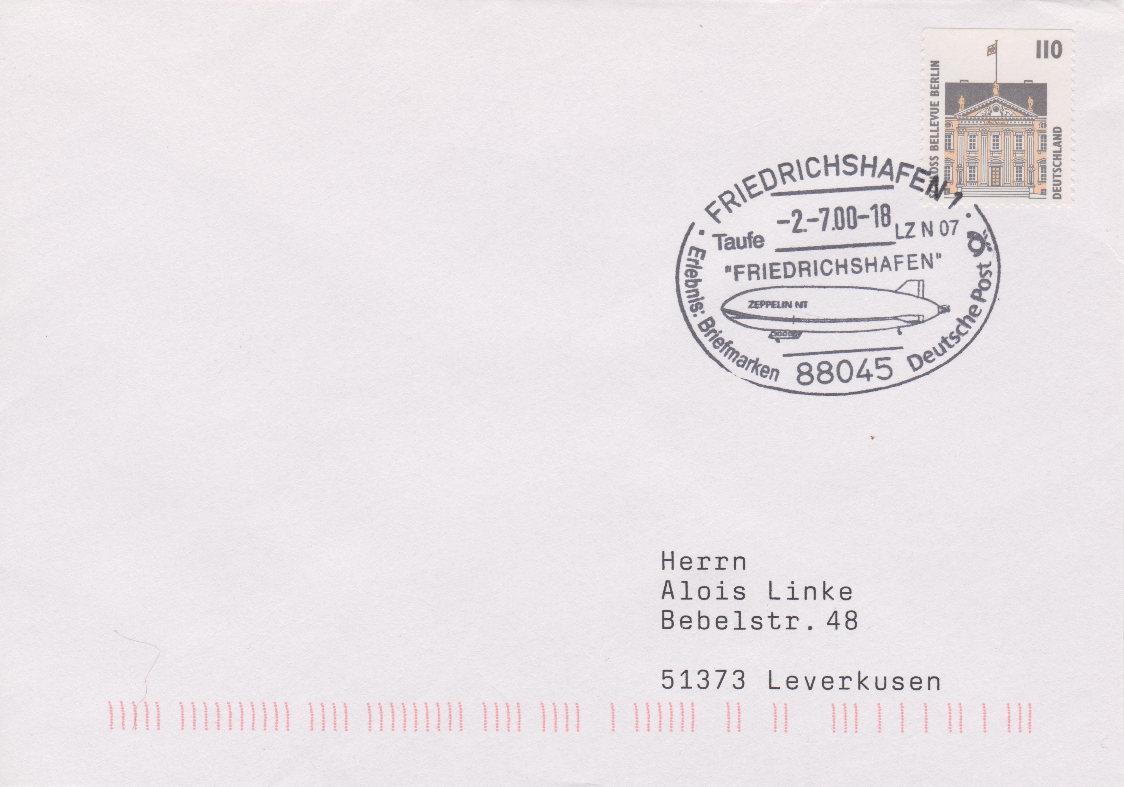 Die Frankatur wurde am 26.02.1998 per HWSt ''88045 FRIEDRICHSHAFEN ZEPPELINSTADT am Bodensee'' entwertet, der als Motiv ebenfalls den Zeppelin NT zeigt.