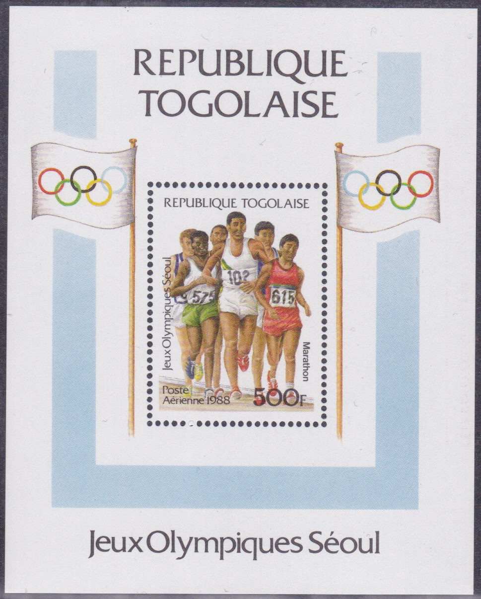Aus Togo kommt dieser Block (MiN Block 308 mit Marke MiNr 2085). Die Marke zeigt eine Gruppe von Marathonläufer.