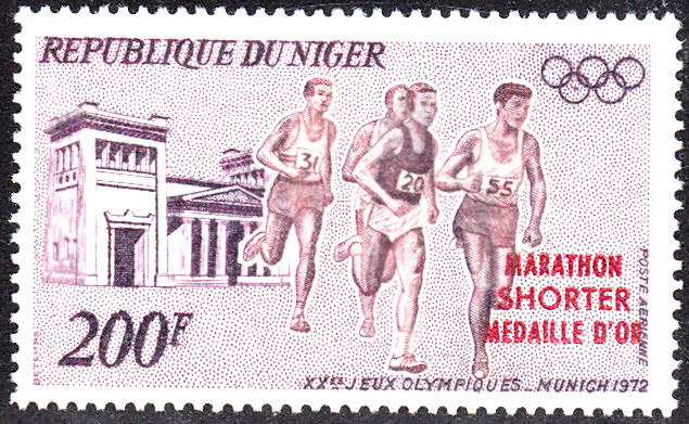 Zum Sieg von Frank Shorter (USA) im Marathonlauf bei den Olympischen Spielen in München erschien im Niger eine Marke (MiNr 351) mit einem Bdr.-Aufdruck.