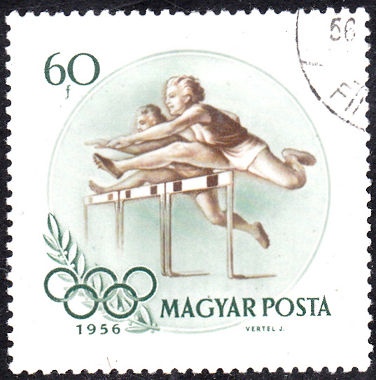 Diese Marke aus der Serie Ungarns zu den Olympischen Sommerspielen 1956 (MiNr 1275) hat als Motiv zwei Hürdenläufer.