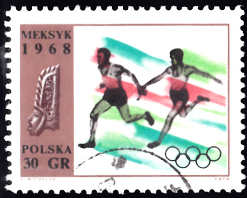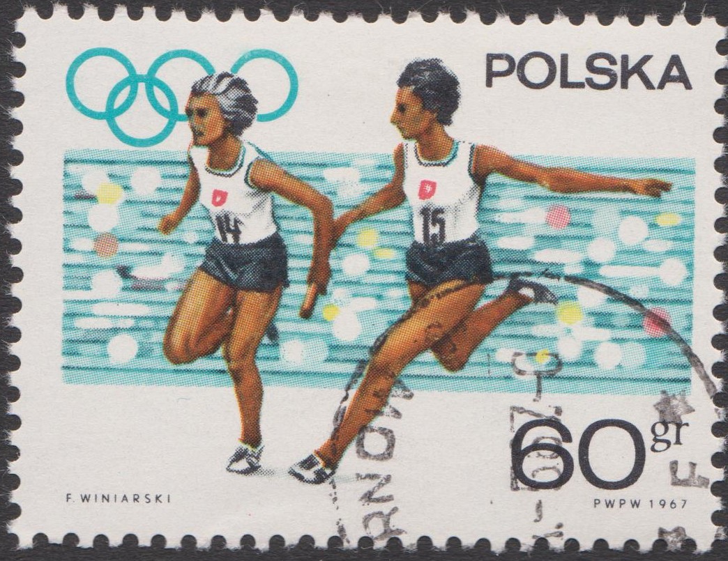 Auch dieses Postwertzeichen, Polen MiNr. 1763, zeigt zwei Läufer bei der Übergabe des Staffelholzes: