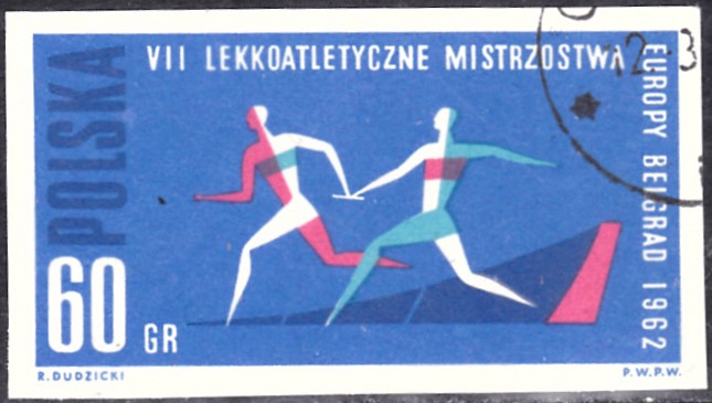 Die hier schon gezeigte Marke aus Polen zu den Leichtathletik-Europameisterschaften 1962 in Belgrad mit der Abbildung zweier stilisierten Staffelläufer bei der Stabübergabe gibt es auch als geschnittene Marke (MiNr 1339 B).