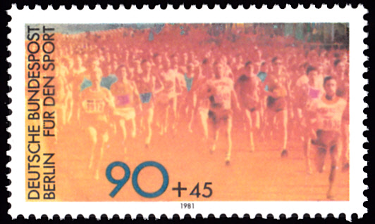 Auf einer Marke aus Berlin (MiNr 646) sehen wir das Teilnehmer Feld bei einem Volkslauf.