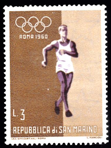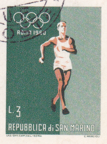 Die hier schon gezeigte Marke (MiNr 647) aus San Marino zu den Olympischen Spielen 1960 in Rom mit einem Geher gibt es auch geschnitten in einer anderen Farbe (MiNr 669).