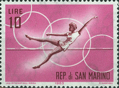 Diese Sportmotiv-Marke aus San Marino zeigt höchst wahrscheinlich eine Sportlerin, die den Schersprung als Sprungstil benutzte. Dieser Stil war im Ausgabejahr 1963 (MiNr. 787) an deutschen Schulen sicher die bevorzugte Sprungstilart. neben dem sich später durchsetzenden "Straddle", dem "Bauchwälzer".