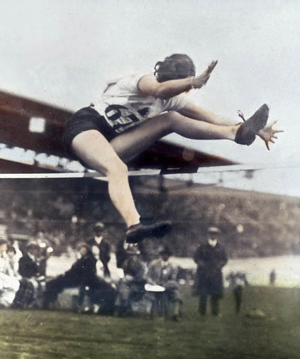 Schersprung als Sprungstil benutzte. Dieser Stil war im Ausgabejahr 1963 (MiNr. 787) an deutschen Schulen sicher die bevorzugte Sprungstilart. neben dem sich später durchsetzenden "Straddle", dem "Bauchwälzer".