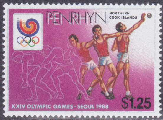 Auf dieser Marke aus Penrhyn (MiNr 485) ist ein Kugelstoßer in verschiedenen Phasen eines Stoßversuches dargestellt.