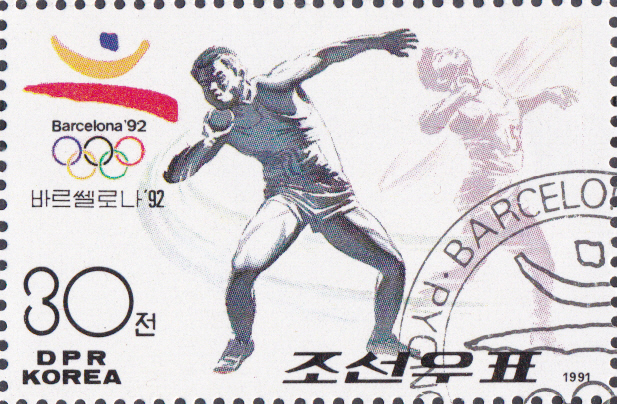 Diese Marke aus Korea-Nord zu 30 Ch (MiNr 3218 A) zu den Sommerspielen 1992 zeigt einen Kugelstoßer.