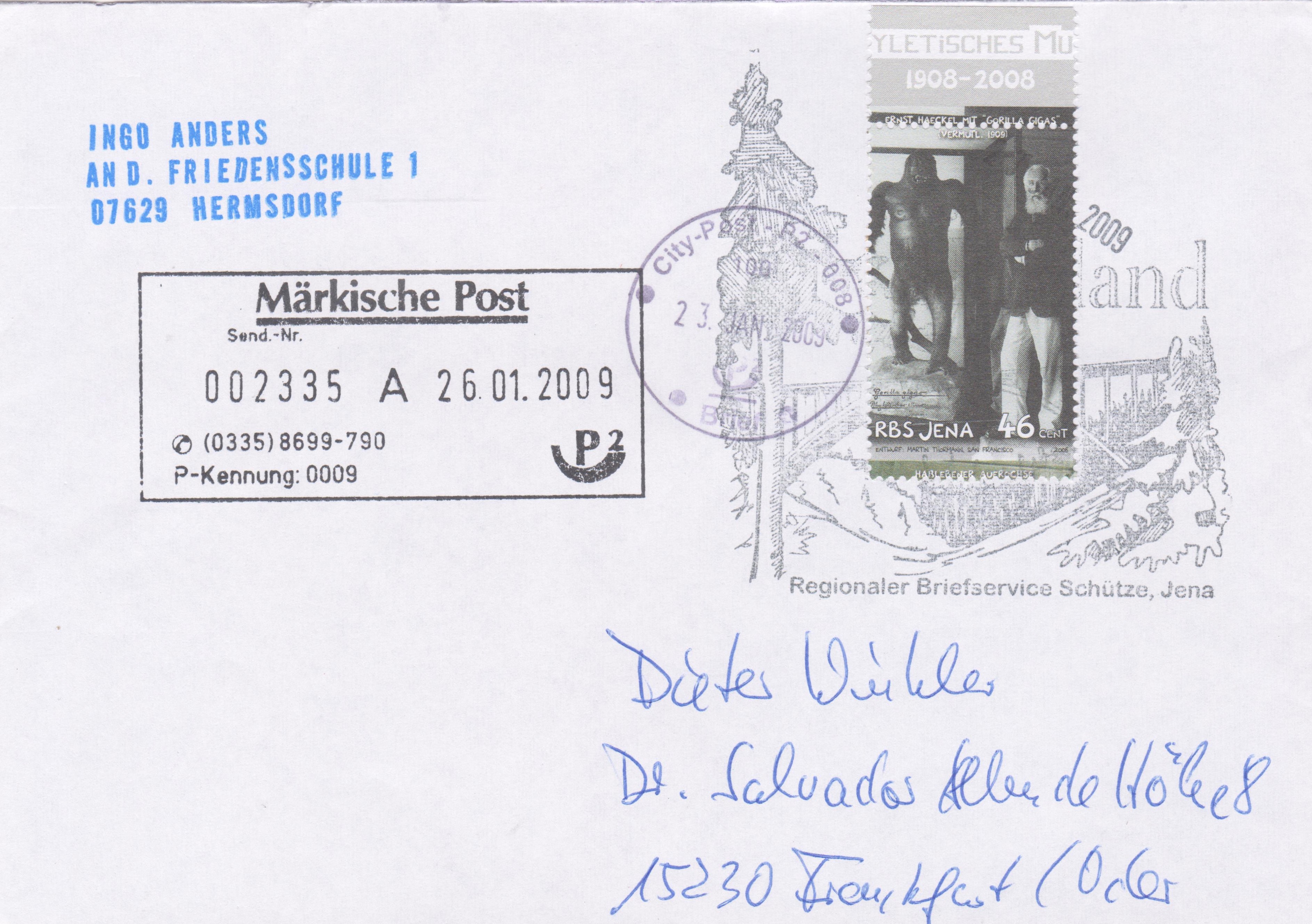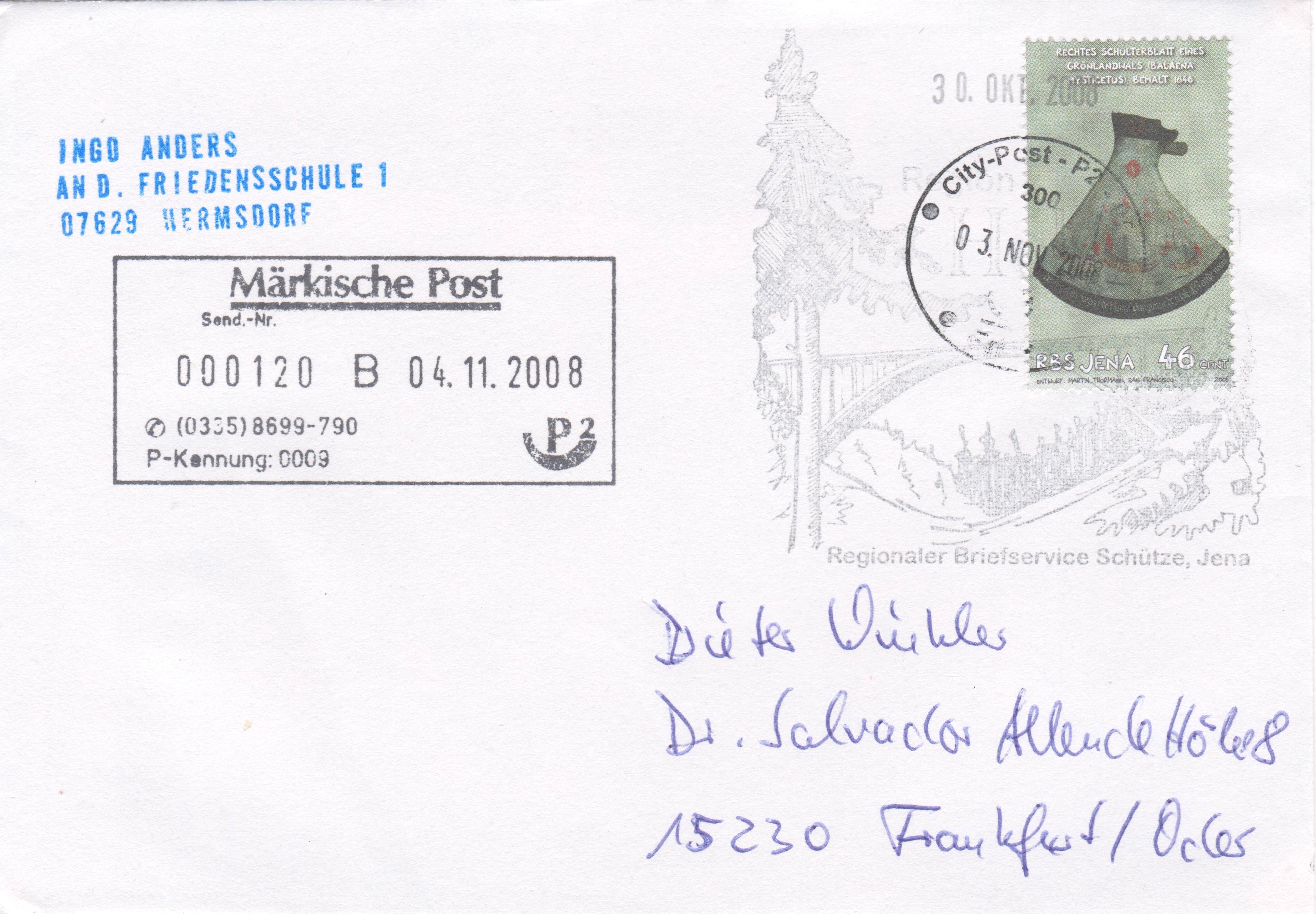 Postwertzeichen RBS Jena, Wertstufe 46 Cent, auf Brief mit Tagesstempel Regionaler Briefservice Schütze, Jena: