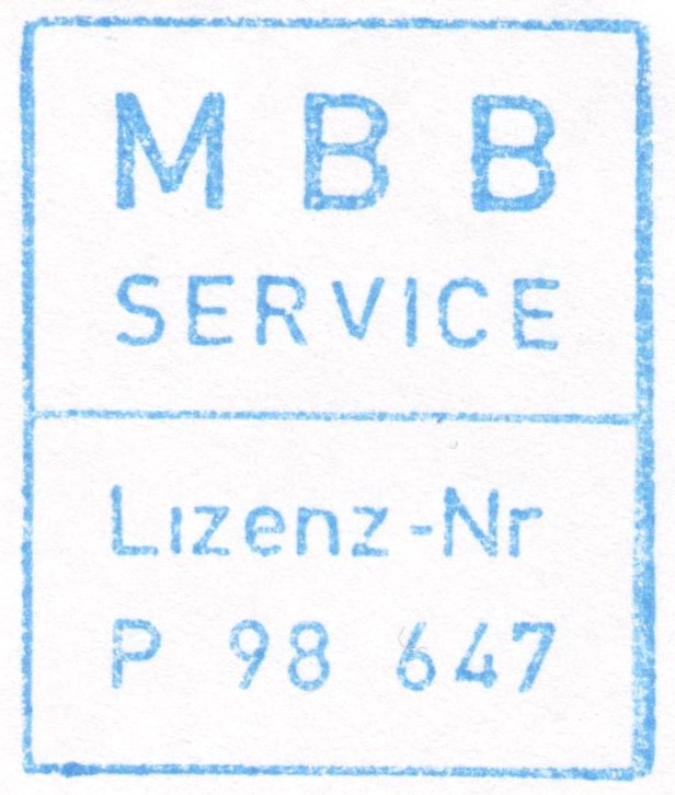 Das Bild zeigt einen Stempel mit der Aufschrift "MBB SERVICE" und einer Lizenznummer "P 98 647". Es handelt sich wahrscheinlich um einen Firmenstempel.