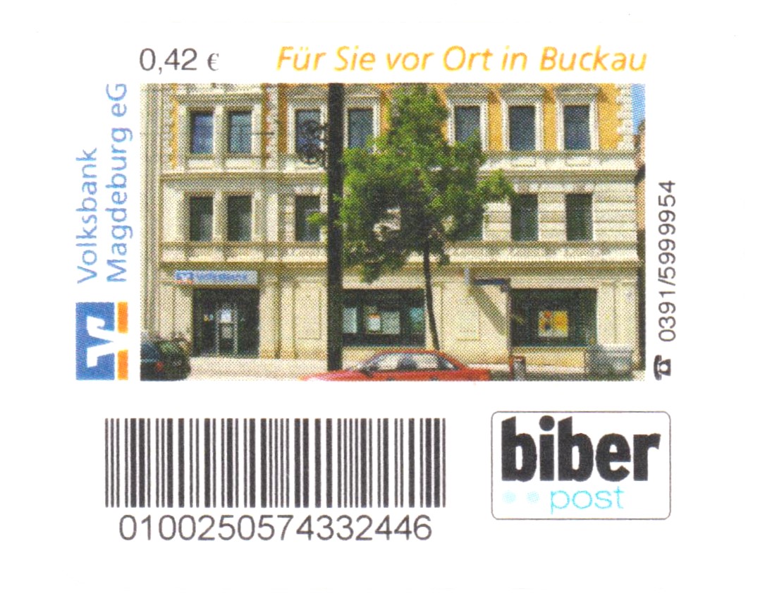 Postwertzeichen der biber post mit Label überklebt und mit Absenderfreistempel neu frankier!