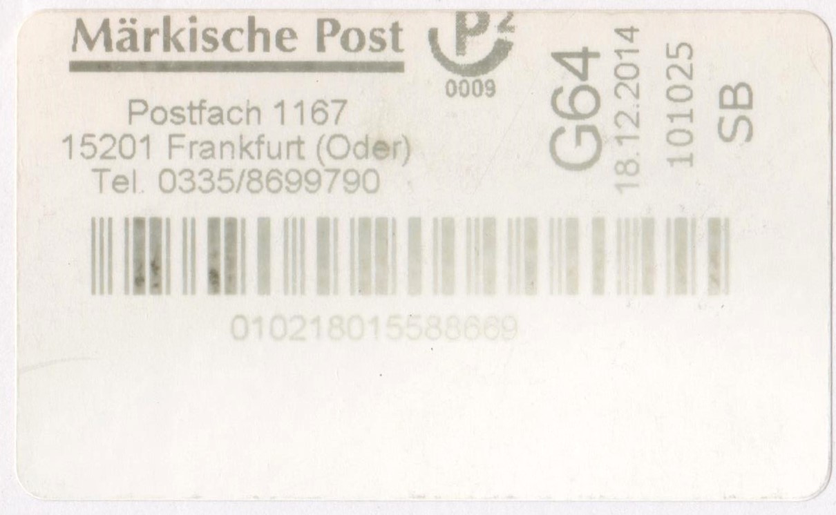 Dieser am 17.12.2014 in Magdeburg bei biber post aufgegebene Brief nach 15230 Frankfurt/Oder wurde am 18.12.2014 zur Zustellung übergeben an die Märkische Post in Frankfurt (Oder), was ein vorderseitig angebrachter Aufkleber dokumentiert: