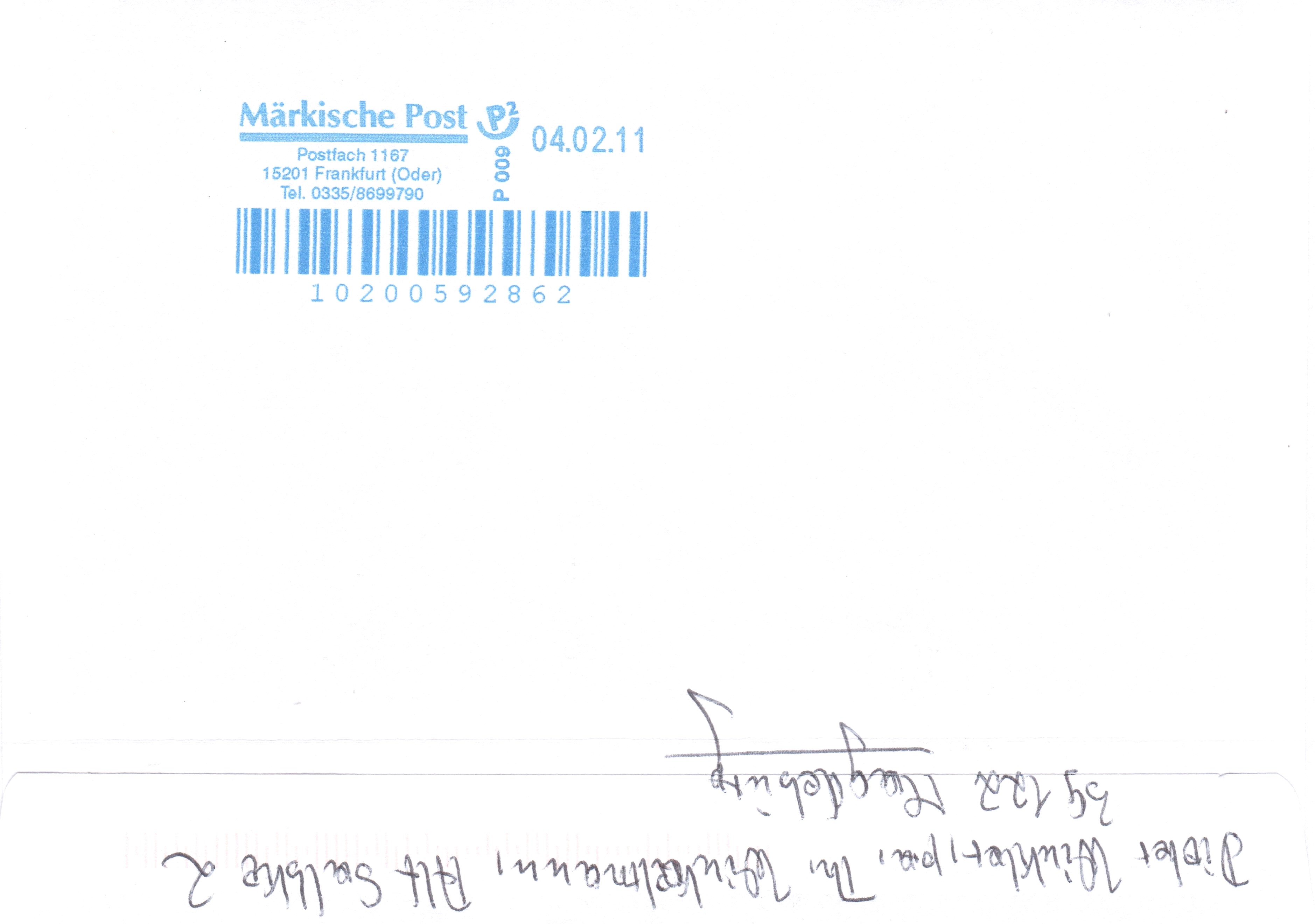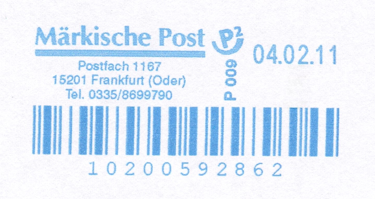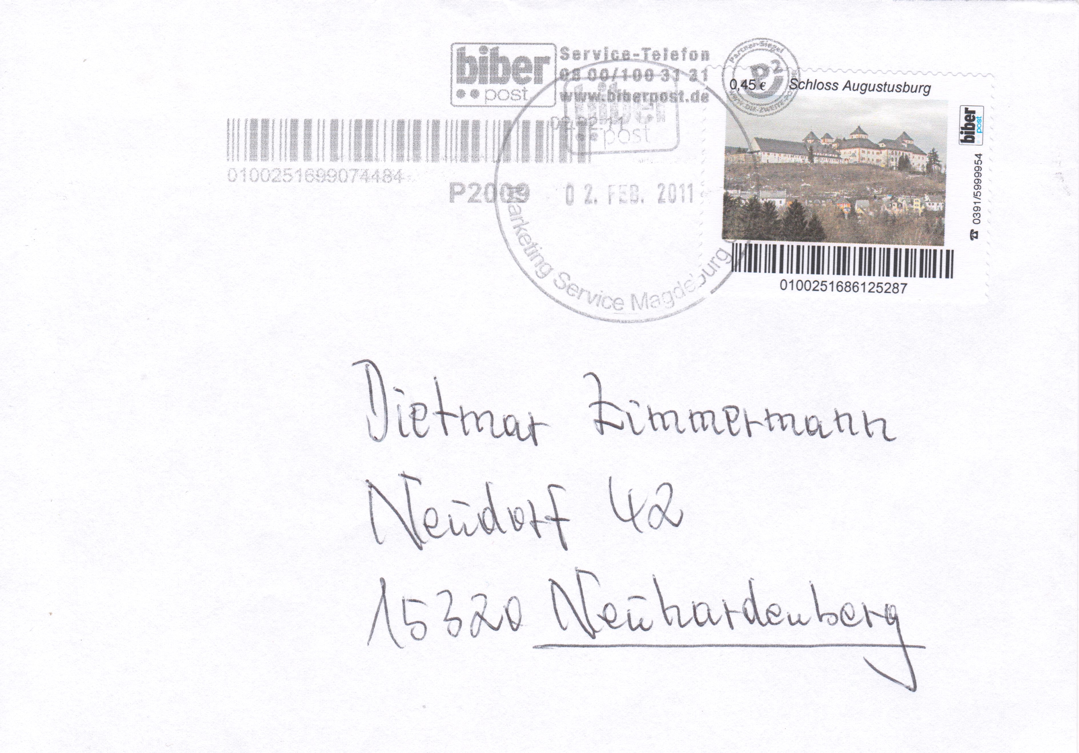 Dieser am 02.02.2011 in Magdeburg bei biber post aufgegebene Brief nach 15320 Neuhardenberg wurde am 04.02.2011 zur Zustellung übergeben an die Märkische Post in Frankfurt (Oder), was ein rückseitig abgeschlagener Stempel dokumentiert: