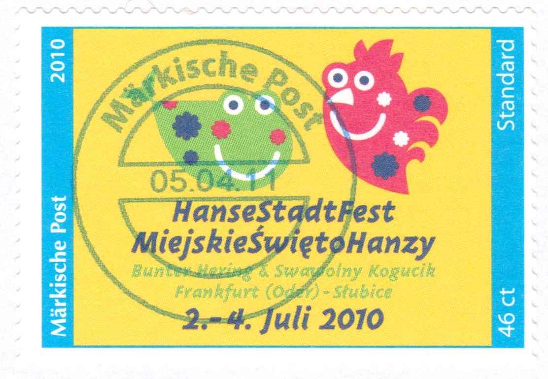 Postwertzeichen Märkische Post "HanseStadtFest 2010", Wertstufe 46 Cent, als Briefstück mit Tagesstempel Märkische Post 05.04.2011: