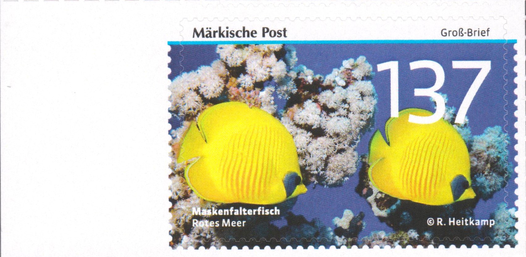 Postwertzeichen Märkische Post "Maskenfalterfisch", Wertstufe 137 Cent, als Briefstück mit Tagesstempel Märkische Post 08.04.2016: