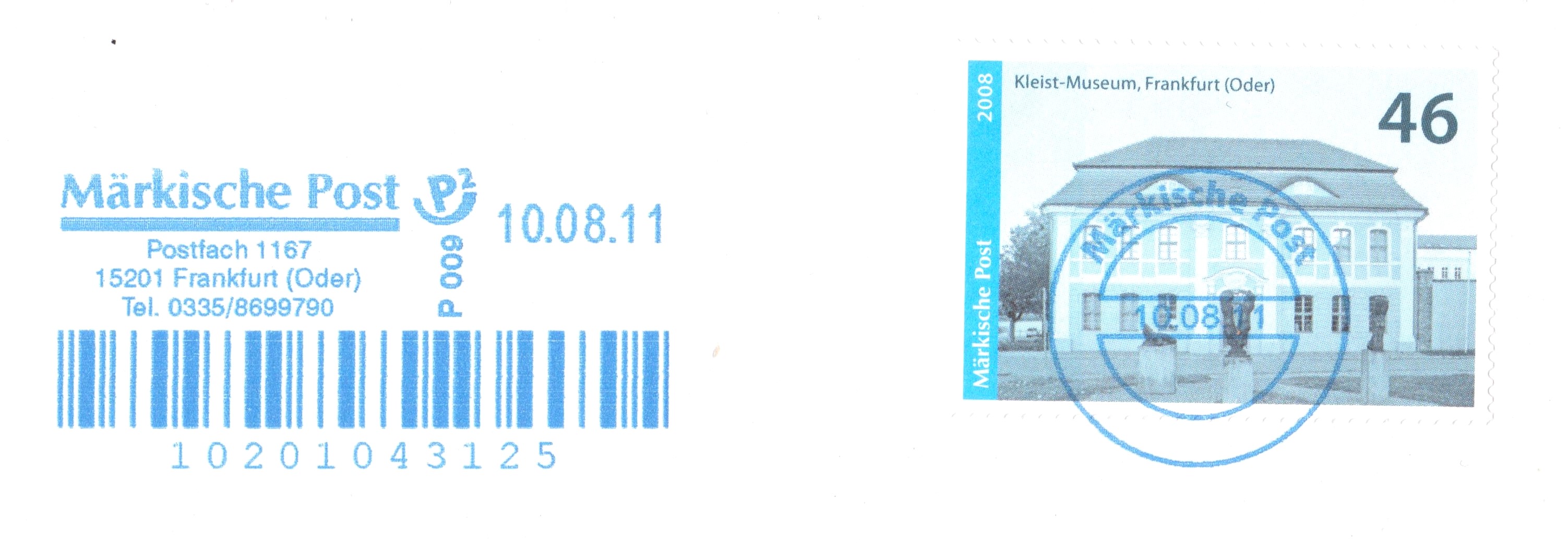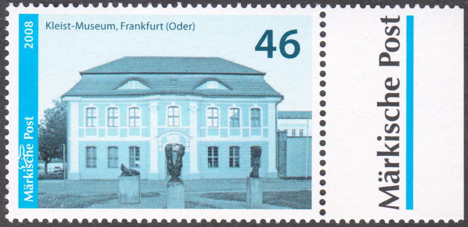 Postwertzeichen Märkische Post "Kleist-Museum, Frankfurt (Oder)", Wertstufe 46, als Briefstück mit Tagesstempel Märkische Post 20.10.2010: