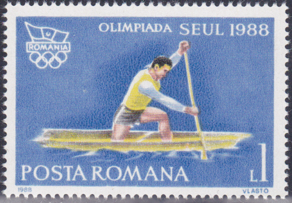 Die hier schon früher gezeigte gezähnte Marke aus der 1964 erschienenen Serie "Olympiasieger" aus Rumänien zum Gewinn von zwei Goldmedaillen durch Leon Rotman im Einer-Canadier gibt es in einer etwas anderen Farbe auch geschnitten (MiNr 2353).