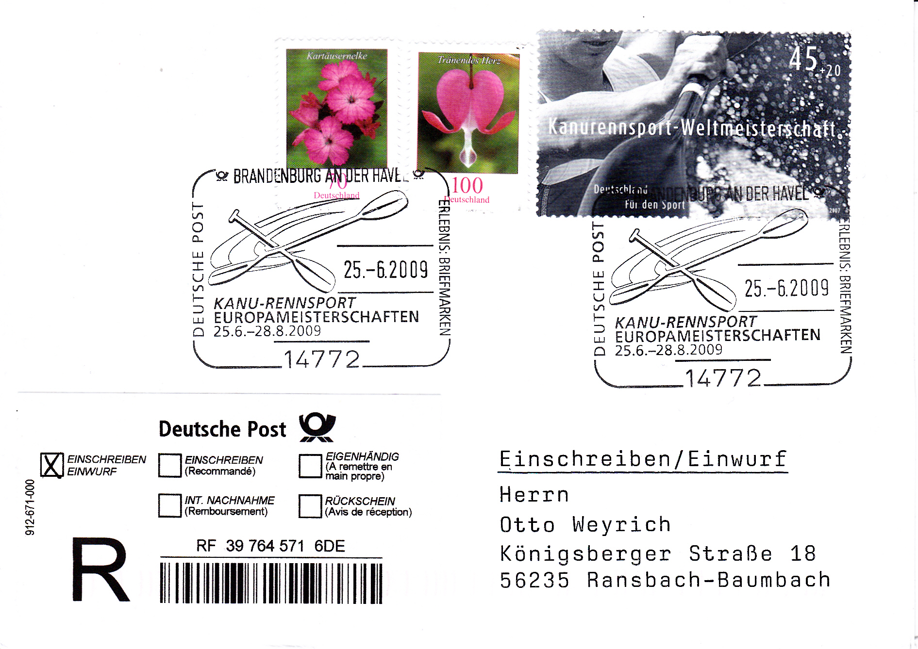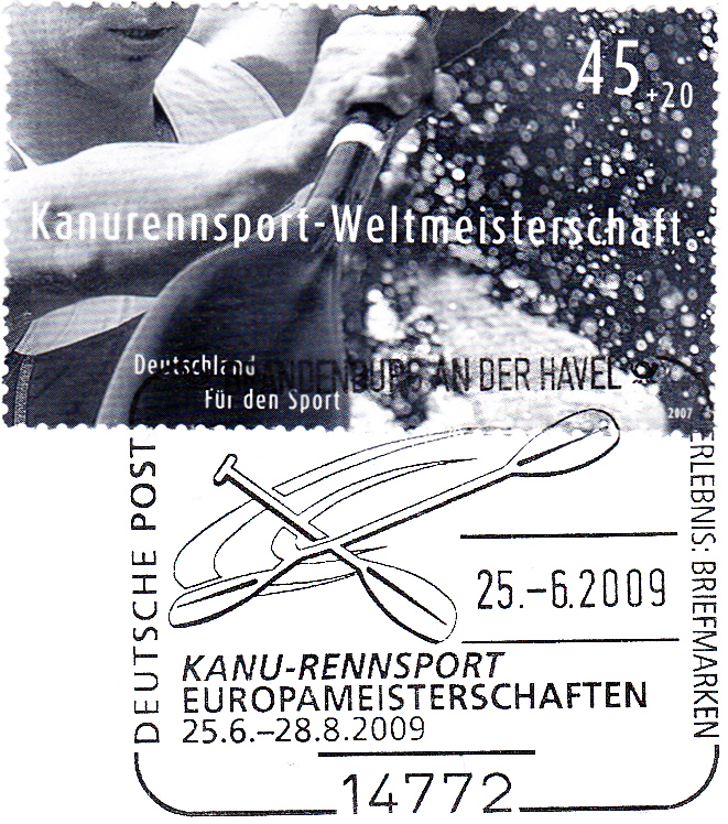 Einwurf-Einschreibebrief mit dem Sonderstempel aus Brandenburg an der Havel vom 25.6.2009 zur Europameisterschaften 2009 im Kanu-Rennsport.