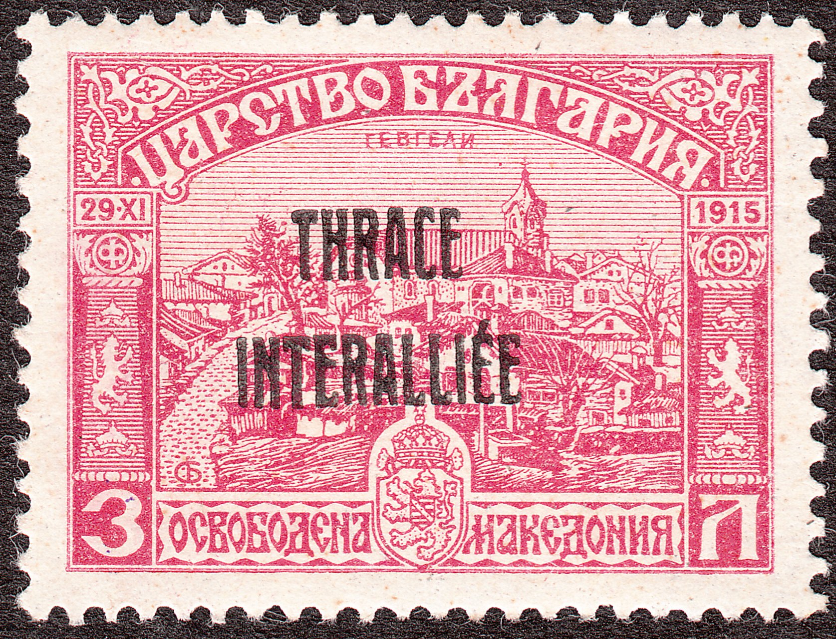 Die Freimarke Bulgarien MiNr. 118 zu 3 Lewa wurde 1919 mit schwarzem, zweizeiligem Aufdruck "THRACE INTERALLIÉE" versehen und als Thrakien Interalliierte Verwaltung MiNr. 9 katalogisiert: