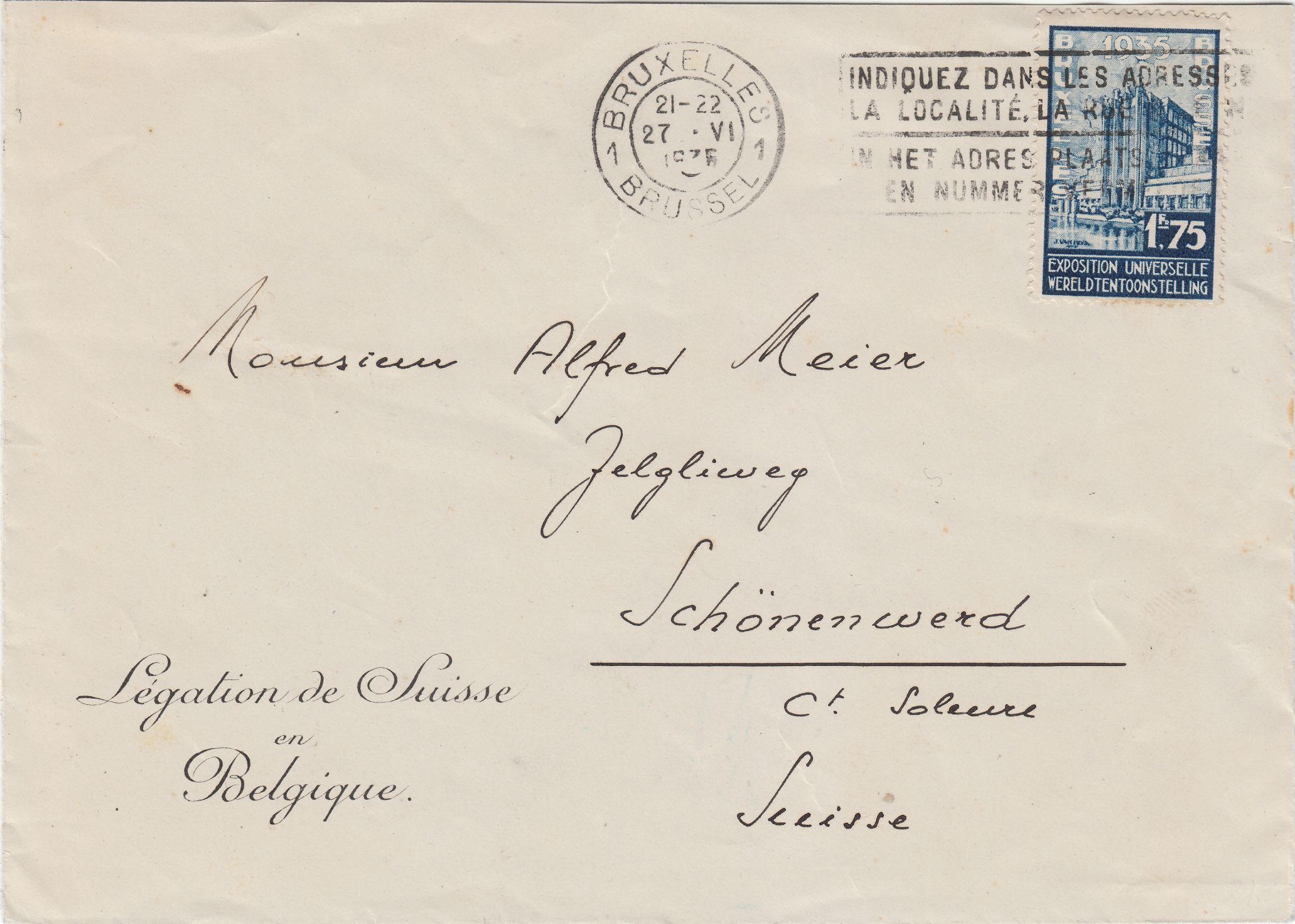 Hier eine EF der Sondermarke mit dem Motiv "Grosser Palast der belgischen Sektion", Belgien MiNr. 381, die am 01.07.1934 in Belgien im Rahmen eines Satzes von 4 Werten zur EXPO in Brüssel erschienen war, entwertet am 27.06.1935 per Maschinenstempel in Brüssel: