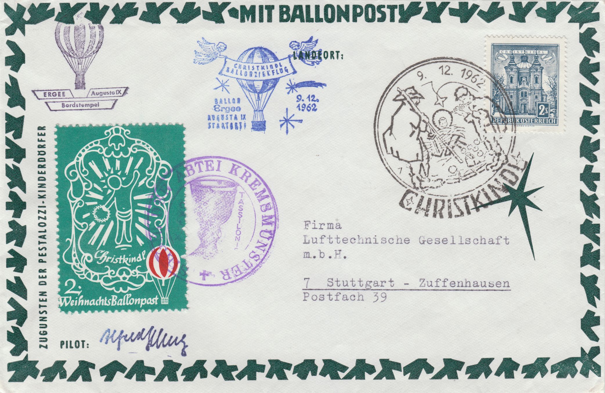 Dieser Beleg wurde am 09.12.1962 als "2. WeihnachtsBallonpost" mit dem Ballon "ERGEE AUGUSTA IX" befördert.