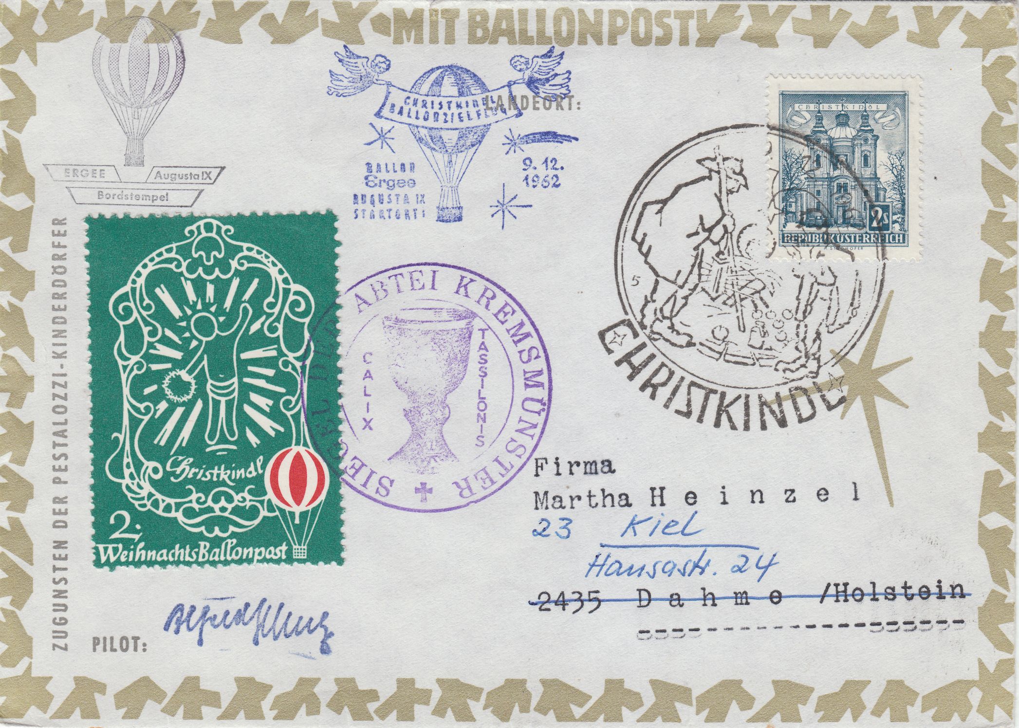 Hier der 1962 eingesetzte Sonderstempel CHRISTKINDL mit der Kennziffer "5" auf einem Ballonpostbeleg: