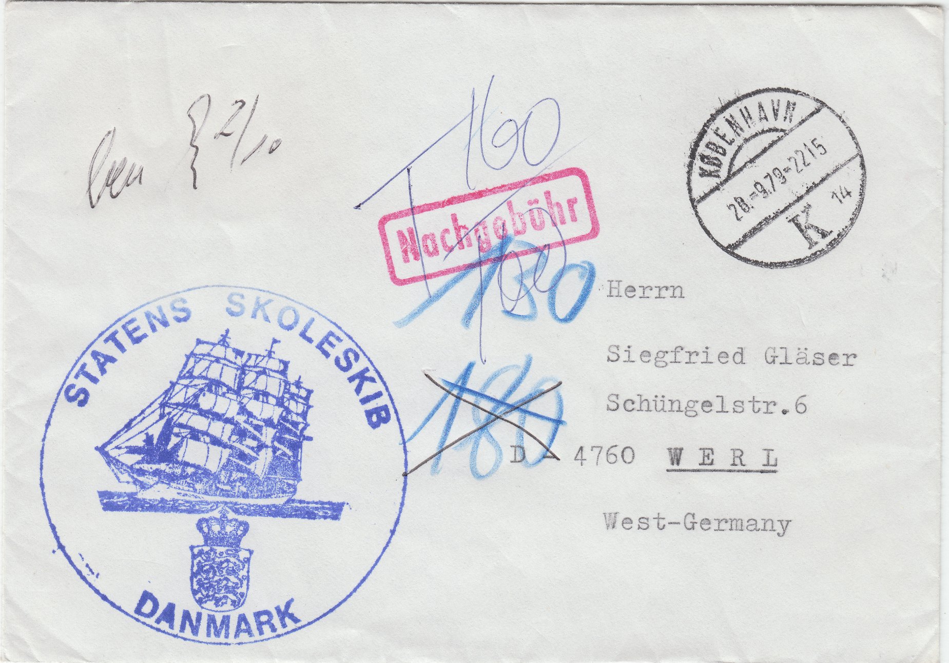 Dieser Beleg wurde ohne Frankatur am 28.09.1979 in Kopenhagen als Heimathafen des Segelschulschiffs DANMARK aufgegeben.