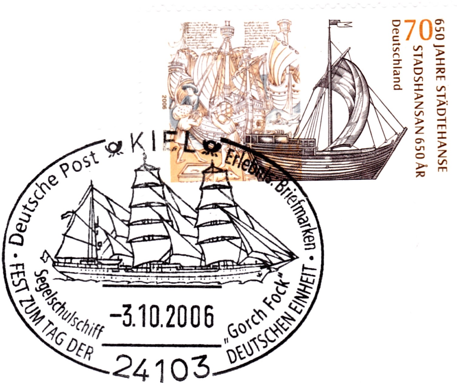 Ein weiterer Sonderstempel aus Kiel zeigt am 3.10.2006 erneut das Segelschulschiff "Gorch Fock" im Stempelbild.