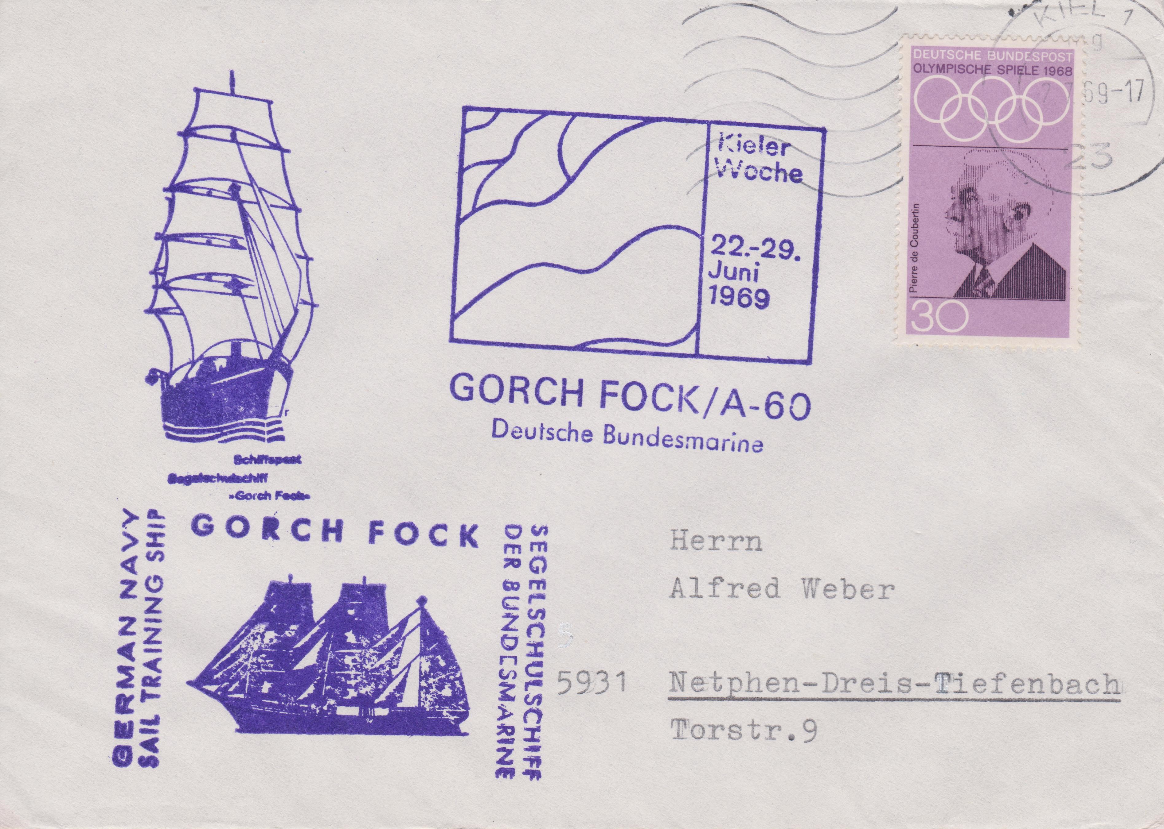 1969 nahm die GORCH FOCK / A-60, das SEGELSCHULSCHIFF DER BUNDESMARINE an der KIELER WOCHE teil, was diese zwei Belege dokumentieren: